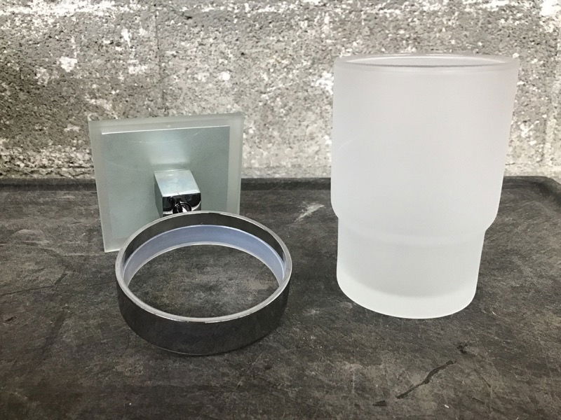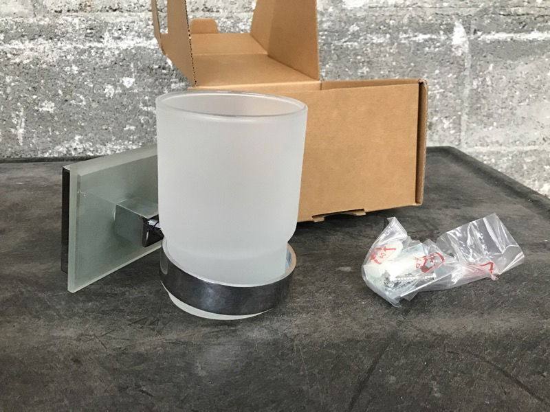 Brand new, in box wall mount chrome tumbler holder with frosted glass cup.