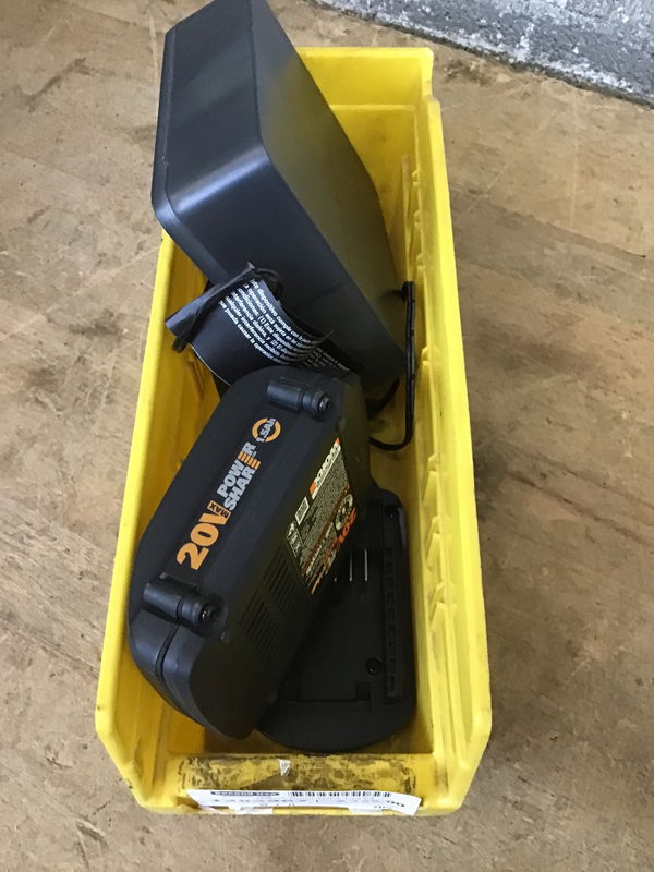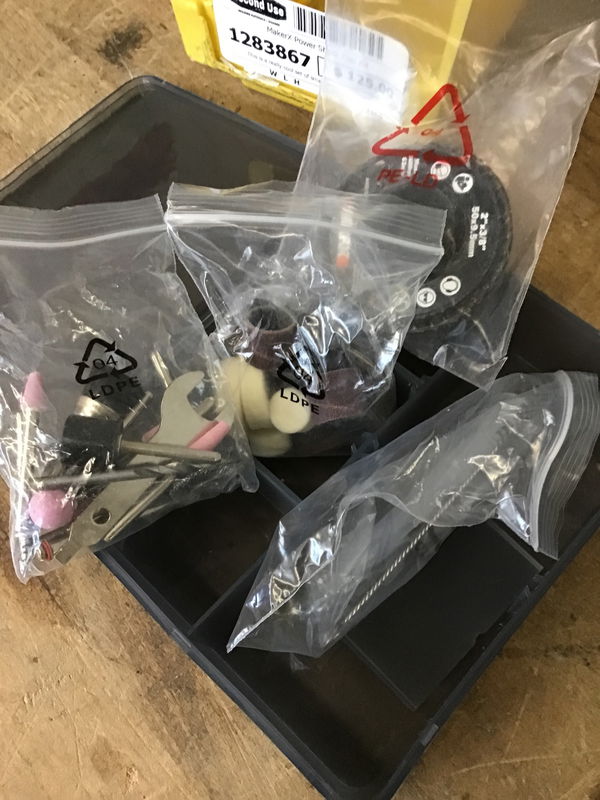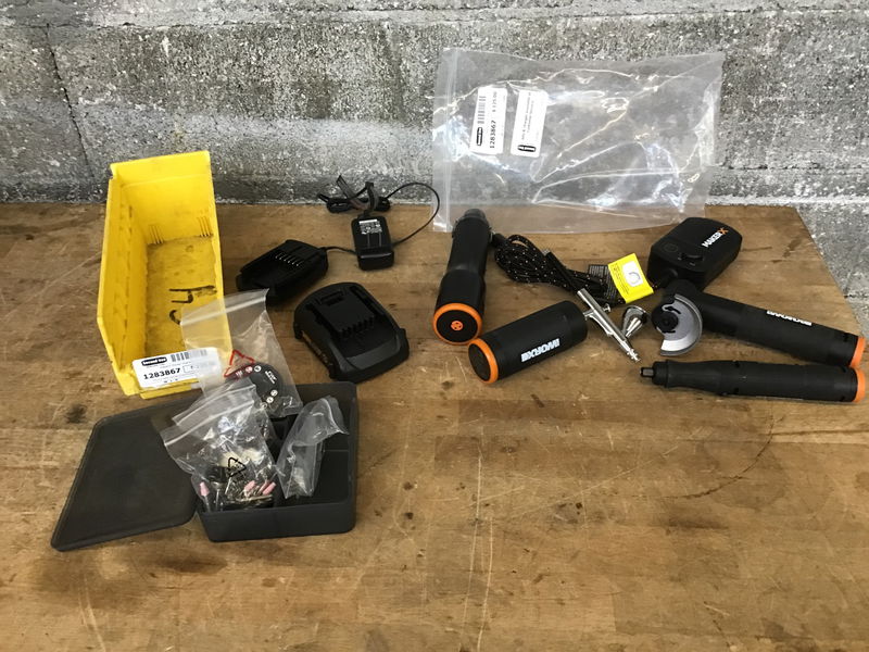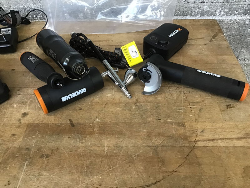 This is a really cool set of small power tools that have a small battery connection that they all use. This kit comes with a small angle grinder with two wheels, a dremel with bits, a heat gun, and a small air paint sprayer. Comes with the battery and a charger.