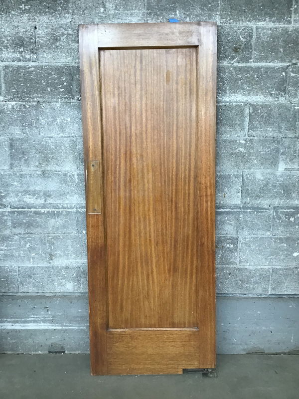 Vintage recessed one panel mahogany door with a medium stain. Still a nice looking door with glass push plates AND has the top hinge pin that mounts on the jamb and recesses into the door. Usually they go missing. The plates for the bottom spring hinge have disappeared though, but they're easier to find than that darn pin.