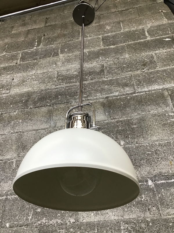 From Park Harbor's "Grinnell" line, with a polished chrome finish to its stem and canopy, and a matte white finish to the bowl shade.