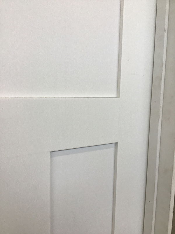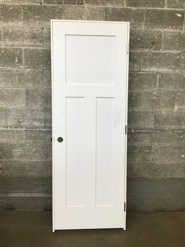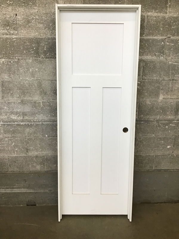 This is a brand new, never installed Craftsman 3 panel door with a single bore and painted white.