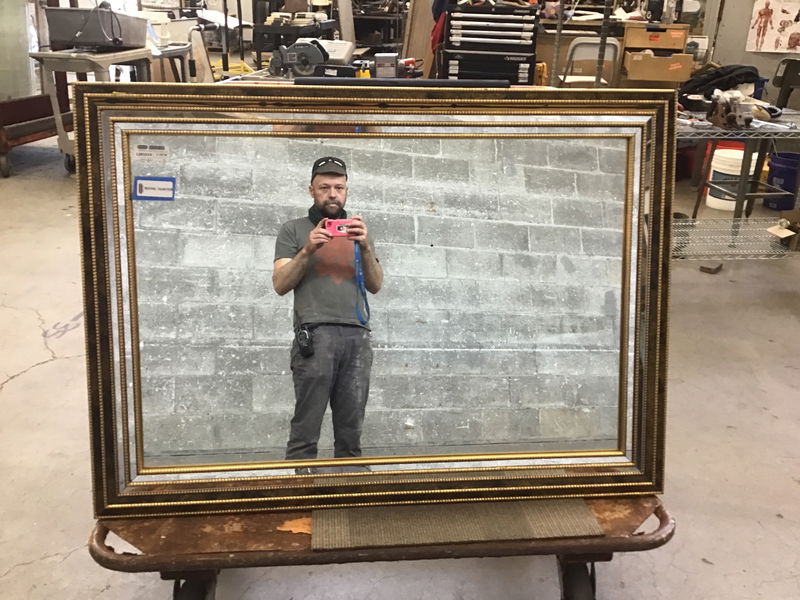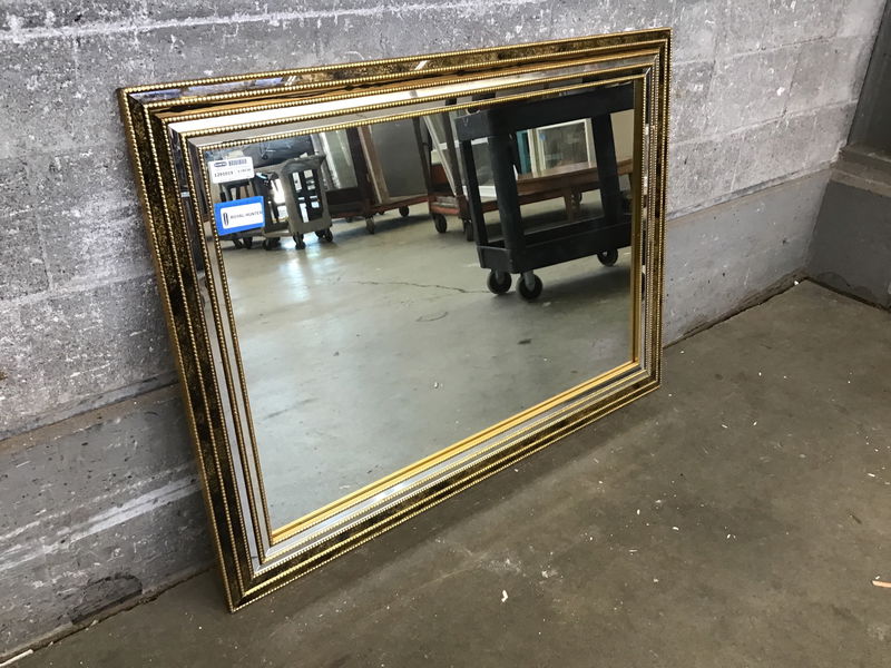 This regal mirror has a golden frame with a plethora of embellishments for you to indulge in while engaging with vanity! It appears to come from Seattle WA by Magnolia Mirror & Glass. There are a few fixable nicks in the embellishments and one rail has fallen off, price reflects.