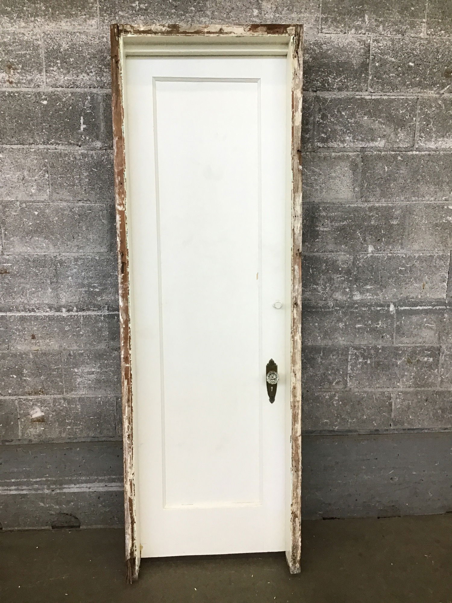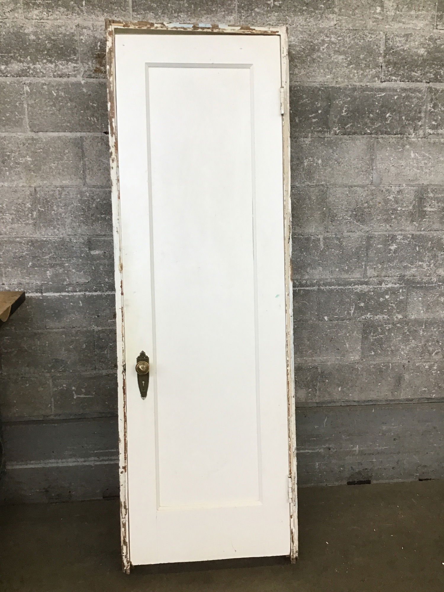 Pre-hung interior door with lots of paint. Also features fancy brass handles and faceplates.