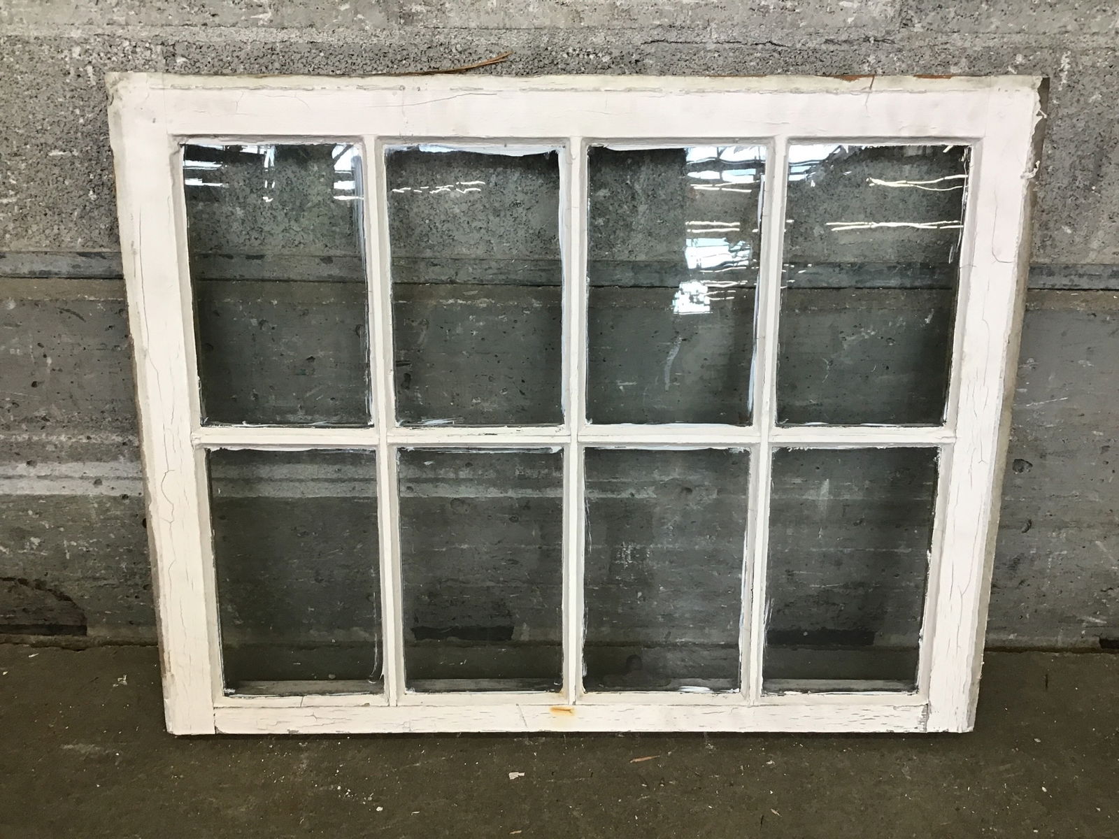 Wooden window sash with white painted finish and 8 true divided lite panes. This would look cute as a basement window or for a warm kitchen.