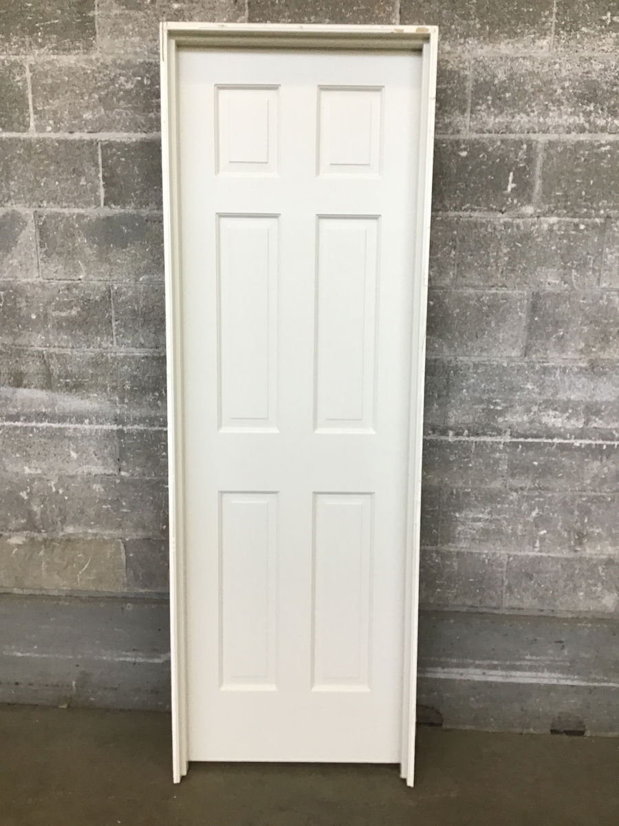 Pre hung, white, six panel interior door with a brushed nickel dummy lever handle. Some cosmetic imperfections may be present but door is in good shape overall.