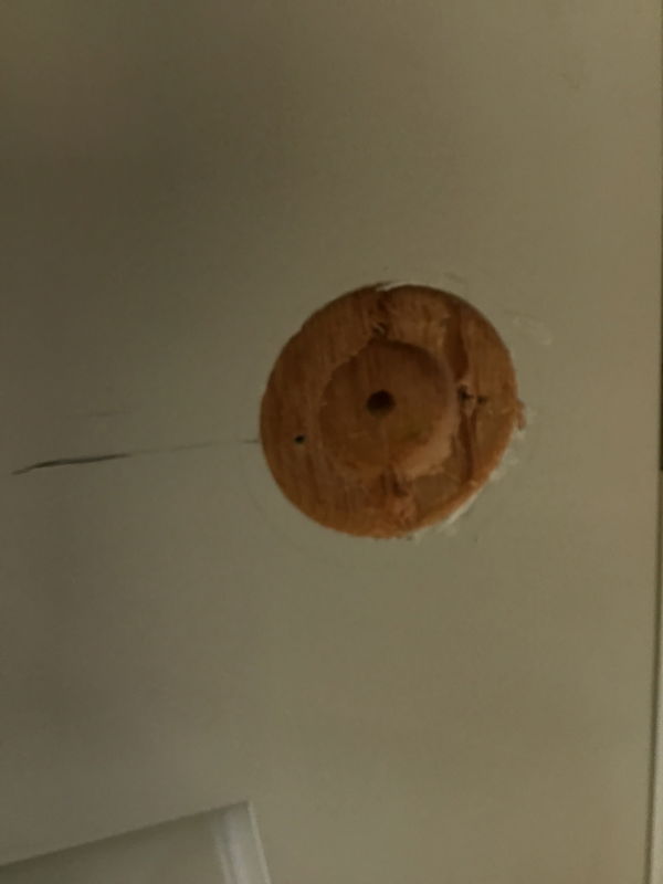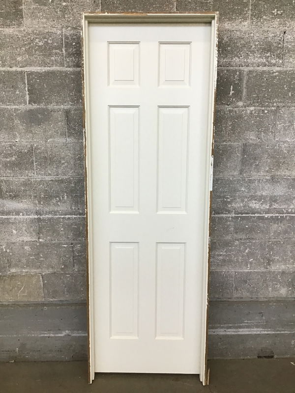 Pre hung, white, six panel interior door that has been drilled for a dummy knob. Some cosmetic imperfections may be present but door is in good shape overall.