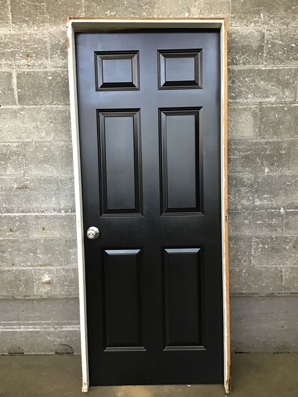 Good looking faux-panel door with decent black paint job and privacy knob.