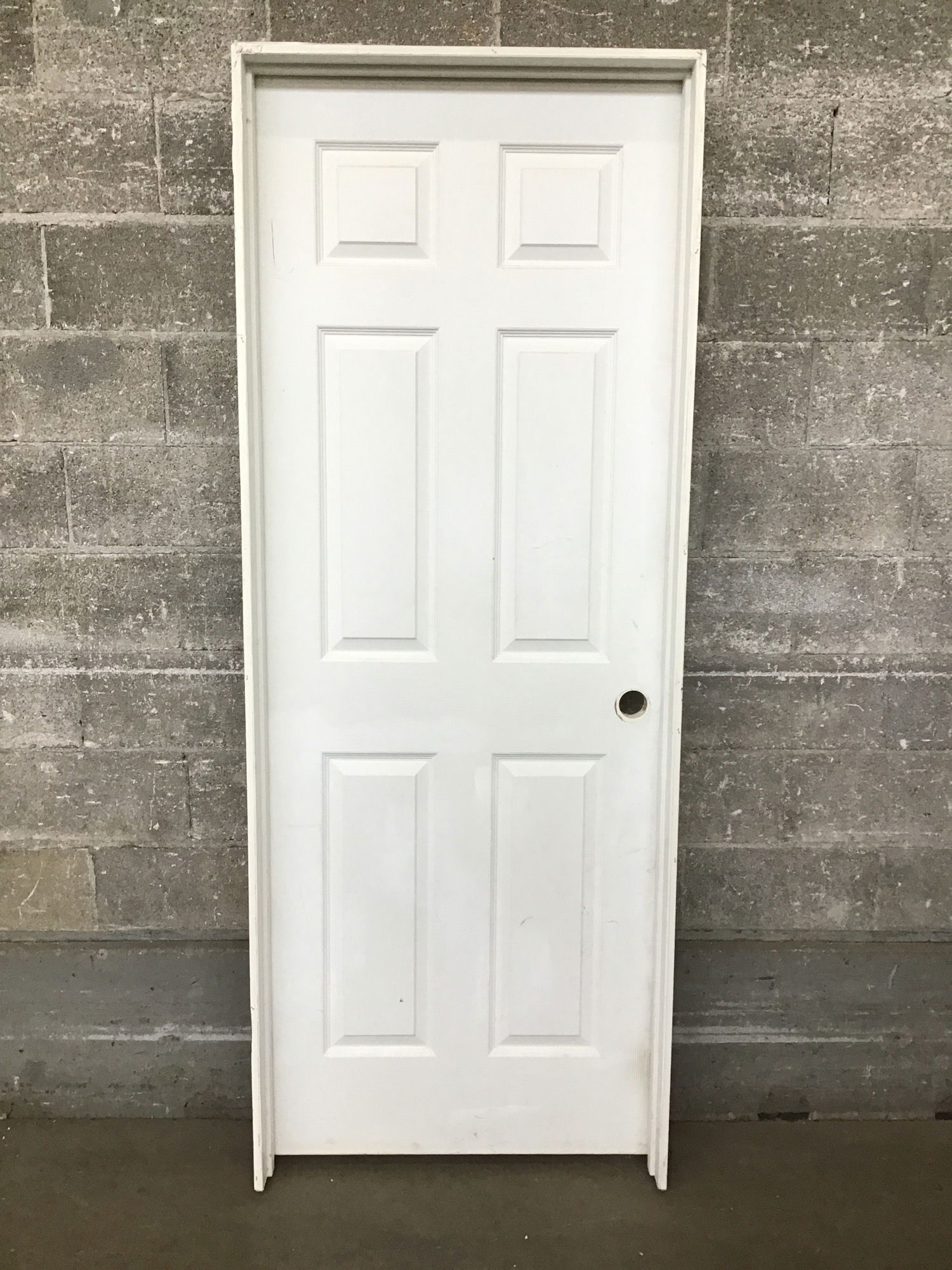 Hollow core interior door with faux wood panel and painted white finish.