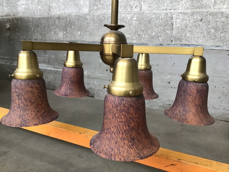 Rejuvenation 5-light chandelier with gorgeous art glass shades and a bright bronze finish, in great shape.