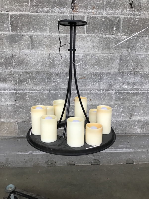 Black finished chandelier with nine bulbs that are each surrounded by a "shade" that looks like a partially burned down candle. Turns out this is the "Hemel Ring" chandelier designed by Kevin Reilly.