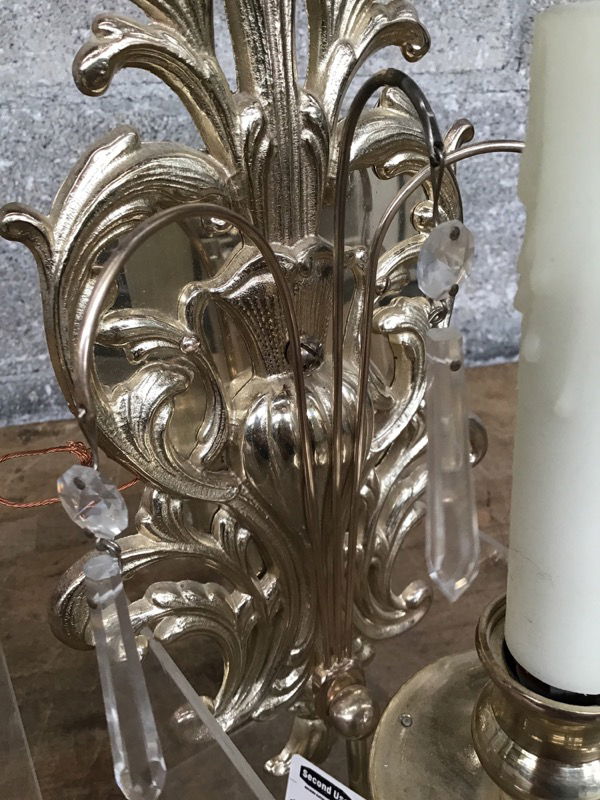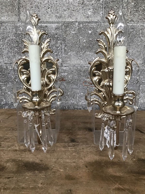 Pair of brass sconces with the familiar Nouveau design. They are reproductions of the older style but well-made and heavy. Decorated with delicate brass arms that hold an array of crystals.