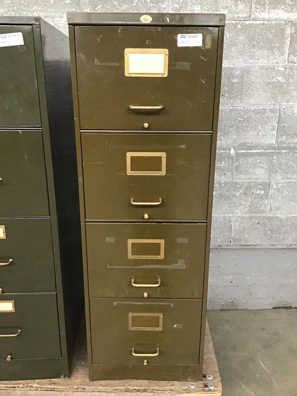 Old school steel filing cabinet with a deep green paint job and bright brass accents.