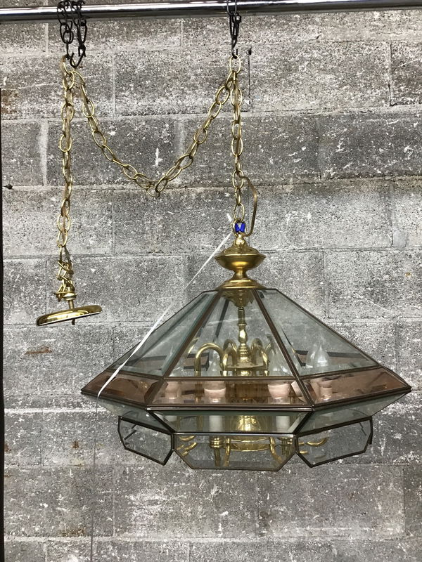Vintage swag chandelier made by luxury brand Fredrick Ramond in 1984. Features 32(!) panes of rosy amber and clear glass, framed by brass caming. These are sought after fixtures; see a similar one that sold for $1,250. With nine bulbs and a really cool pyrimidal look, this light is ready to bring vintage charm to your space. The wiring could use some TLC near the base, but luckily, we have our very own in-house Lighting Services to help! Price reflects condition.