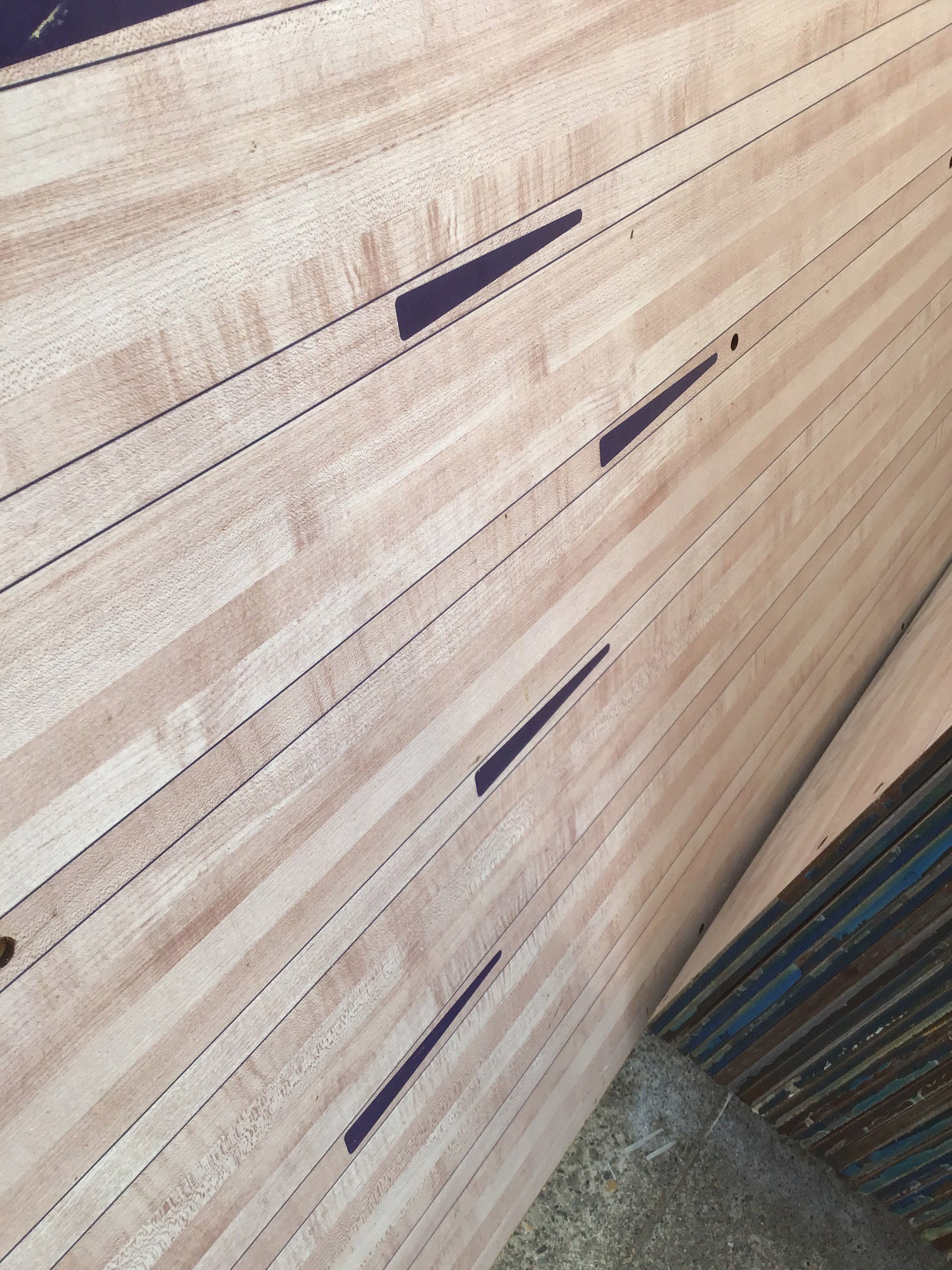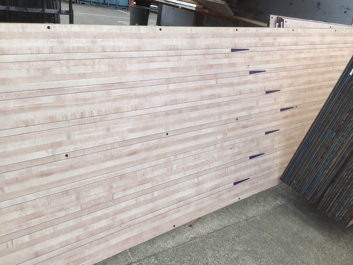Former bowling lane topper with arrows (the newer synthetic lane that now gets put on top of older wood lanes that are too thin to resurface) that is comprised of some sort of dense composite (obvs able to withstand heavy balls being dropped on it) and would be ideal as a shop countertop or even a unique/utilitarian kitchen countertop. Photo may be representative.