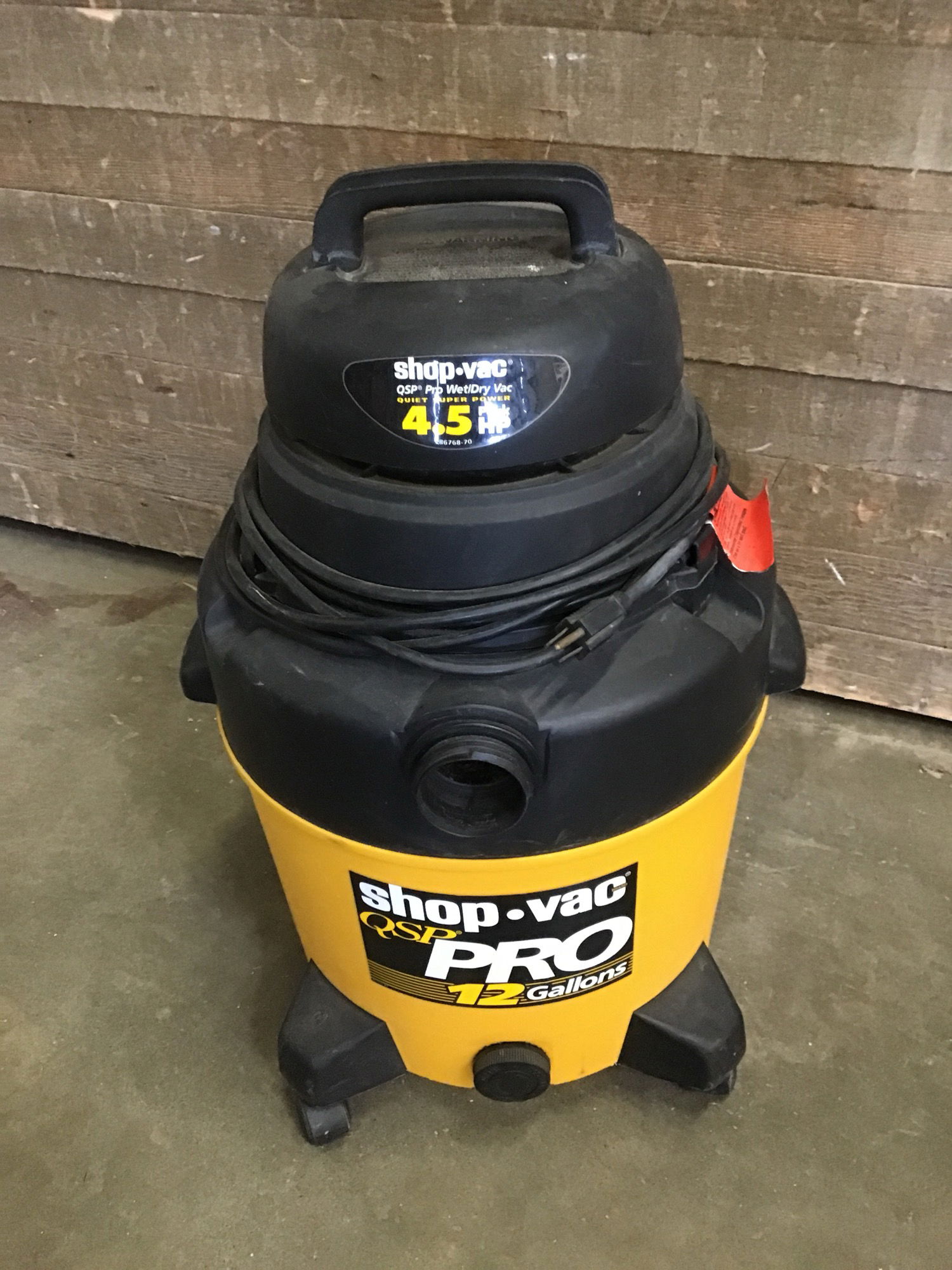 12 Gallon QSP wet/dry Shop Vac Pro. 4.5 HP. Tested in house and appeared fully functional. Needs a hose/attachments. Price reflects.