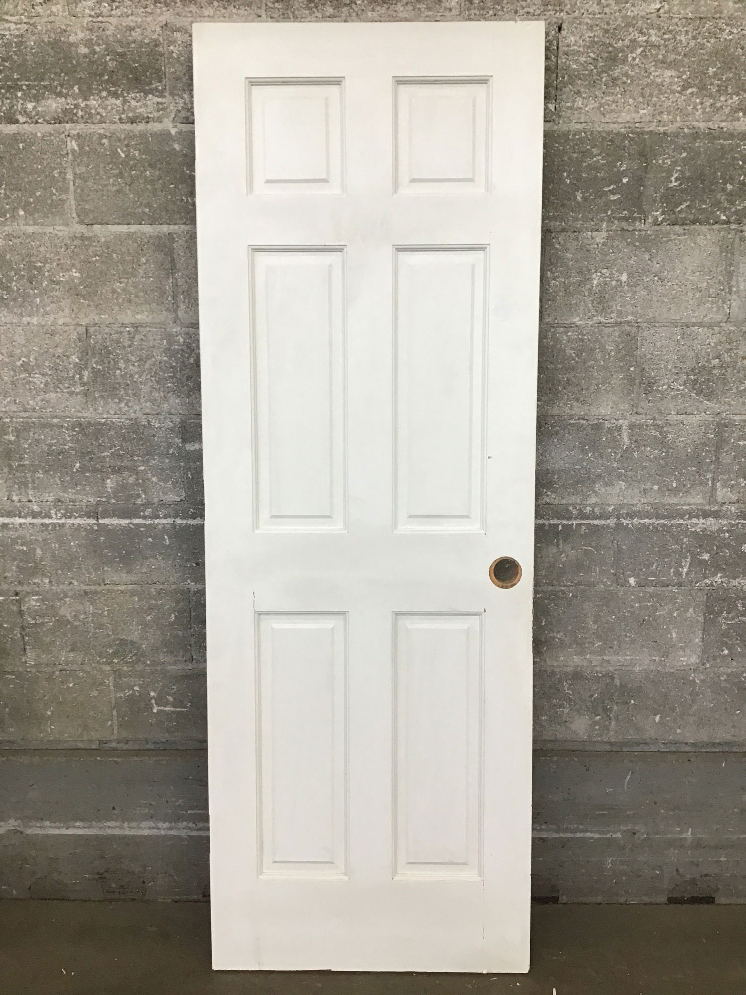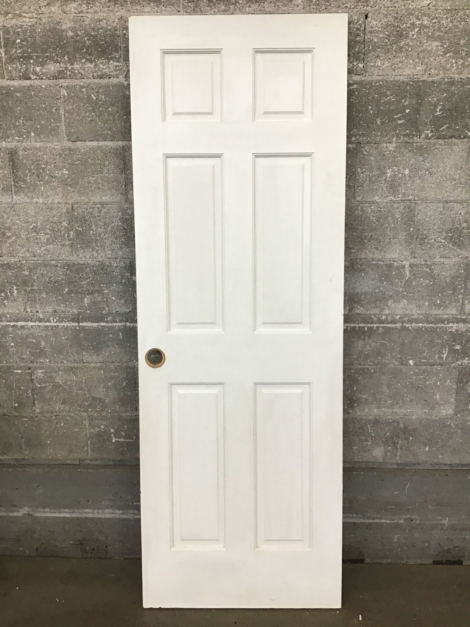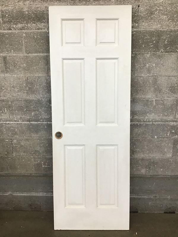 White six panel interior door, painted, no jamb with a right hand swing and an very uncool apple mac sticker on it.