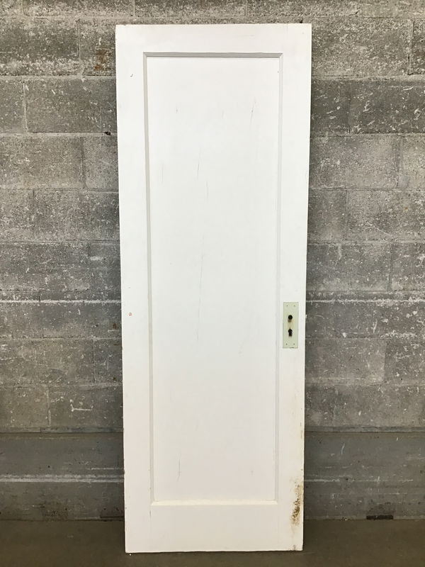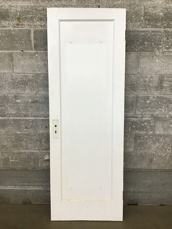 Recessed single panel interior door, painted on both sides. Looks like it may have once had a mirror mounted on one side.