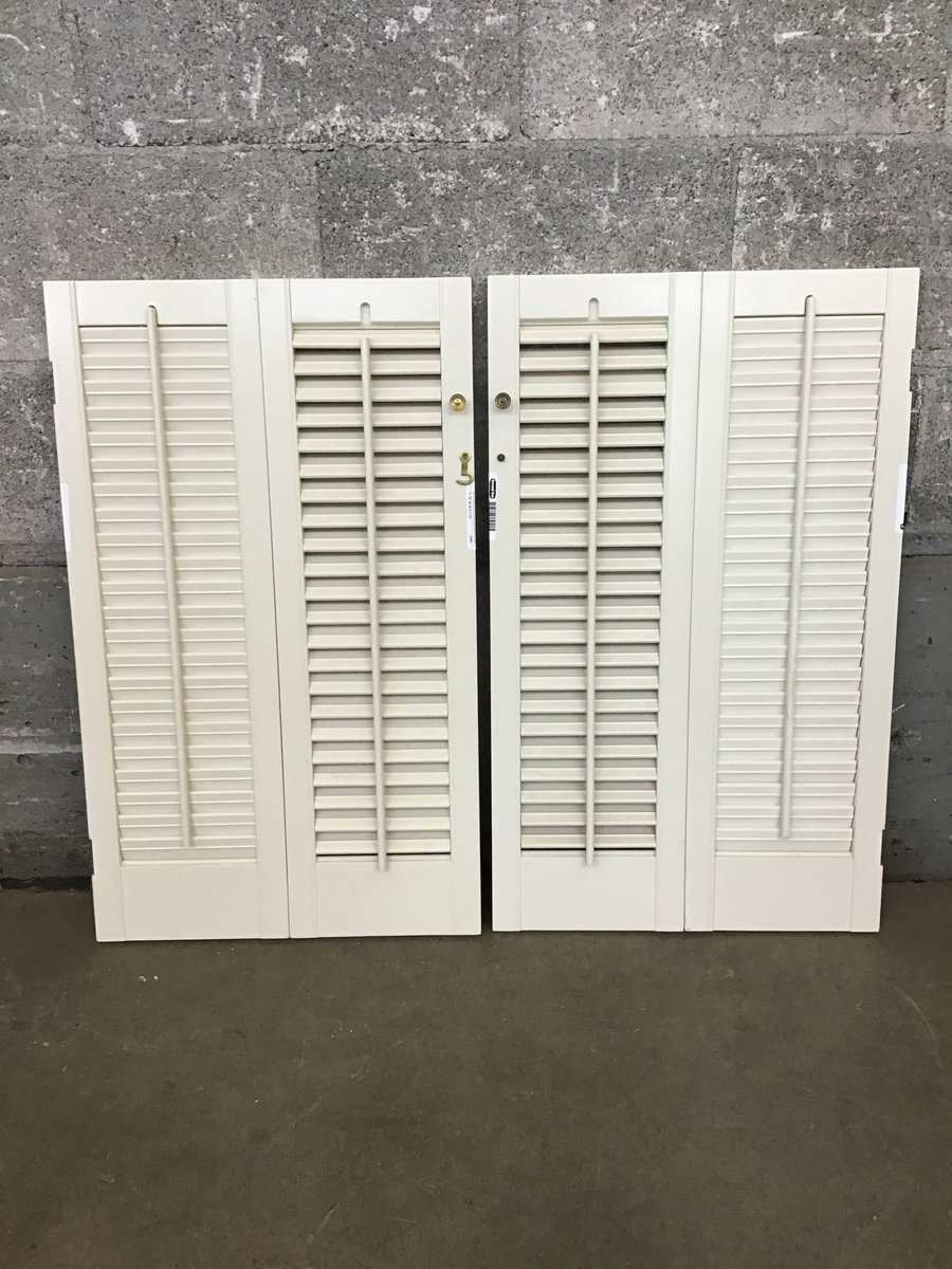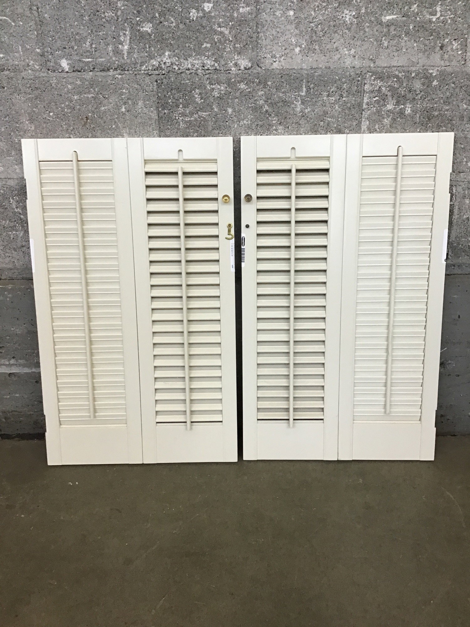 Pair of bi-fold louvered shutters painted white with brass knobs and latch.