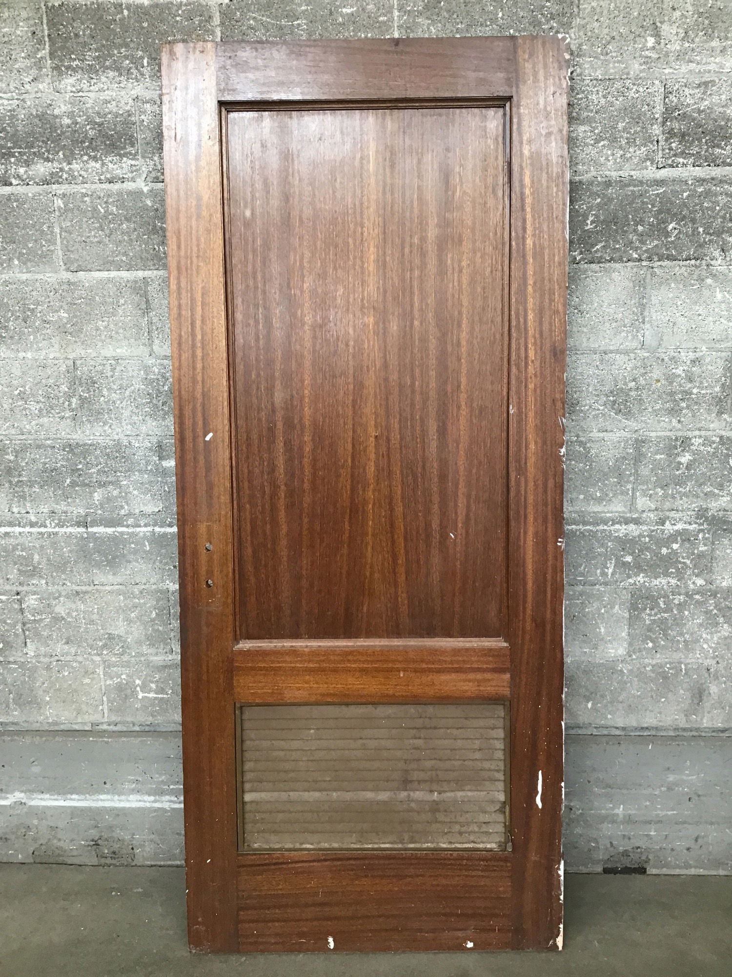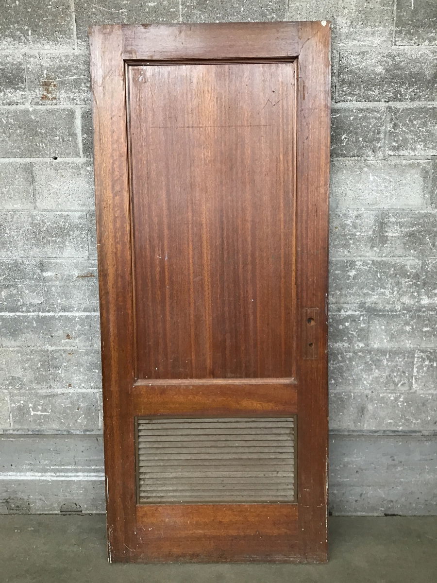 Vintage stained mahogany two panel door that came to us as surplus materials from the old seminary building at St. Edward State Park in Kenmore. Exterior thickness but not recommended for exterior use. This one has sticky but operable louvers in the bottom panel.