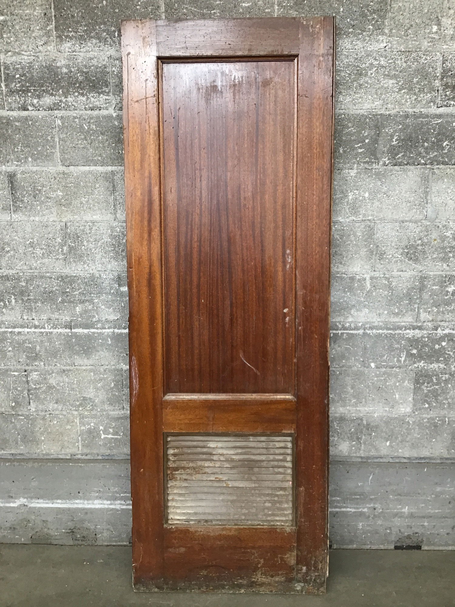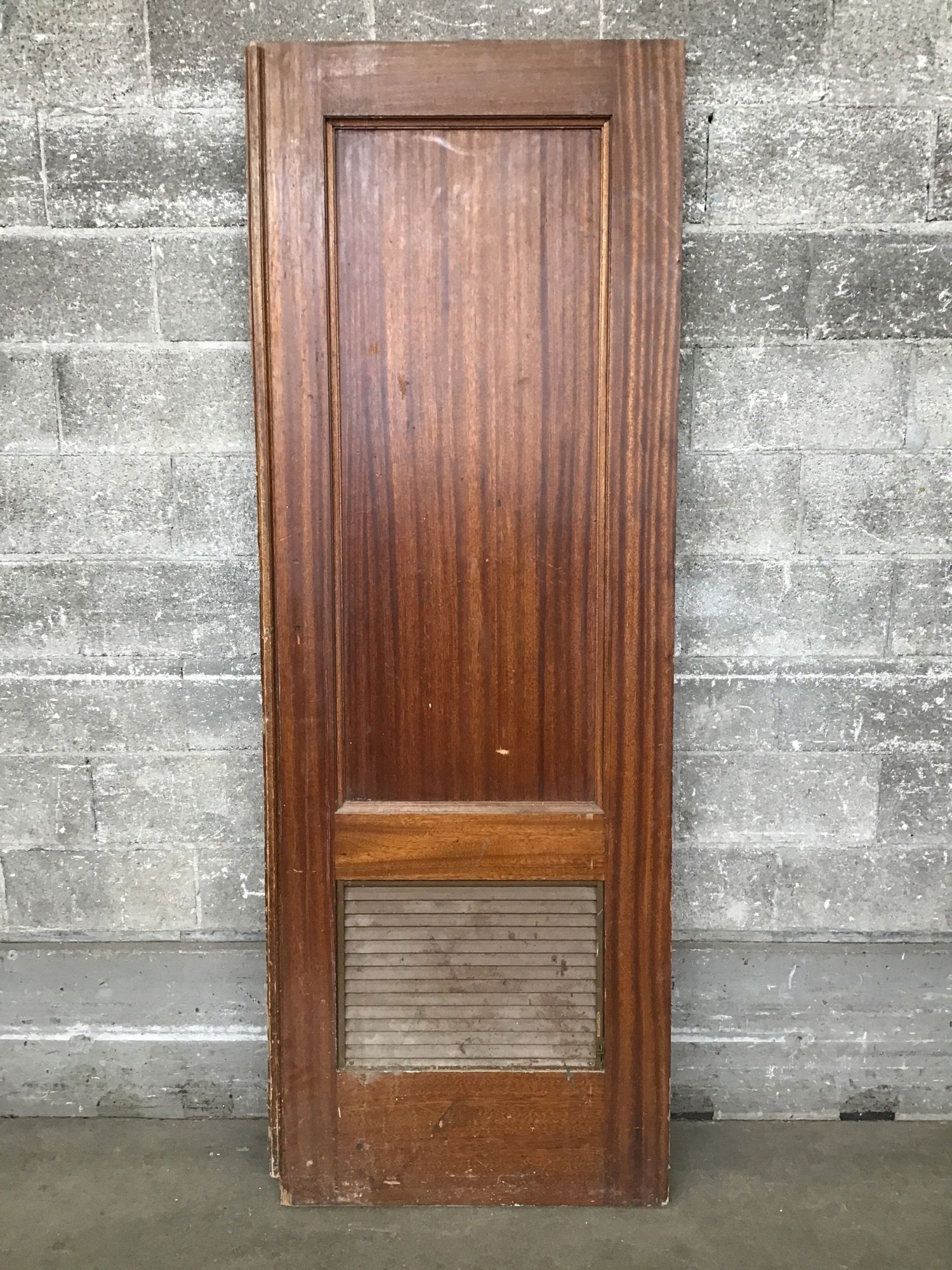Vintage stained mahogany two panel door that came to us as surplus materials from the old seminary building at St. Edward State Park in Kenmore. Exterior thickness but not recommended for exterior use. This one has sticky but operable louvers in the bottom panel. Also has an astragal attached to it as it was previously part of a double door, which is not included in the width.