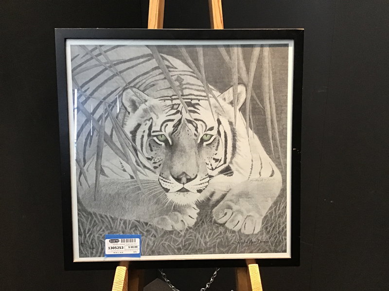 Hand drawn pencil print by husband and wife artist pair Kristin and John Meier from Arizona. This piece is titled "Stillness in Strength" and features a noble tiger sitting and looking right through your soul. Professionally framed and has a certificate of authenticity on the back!