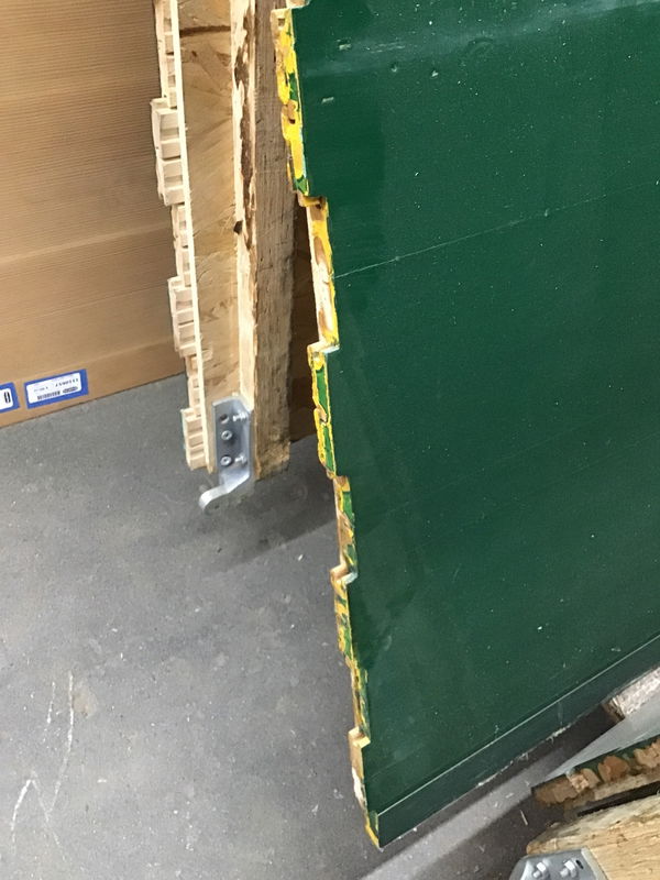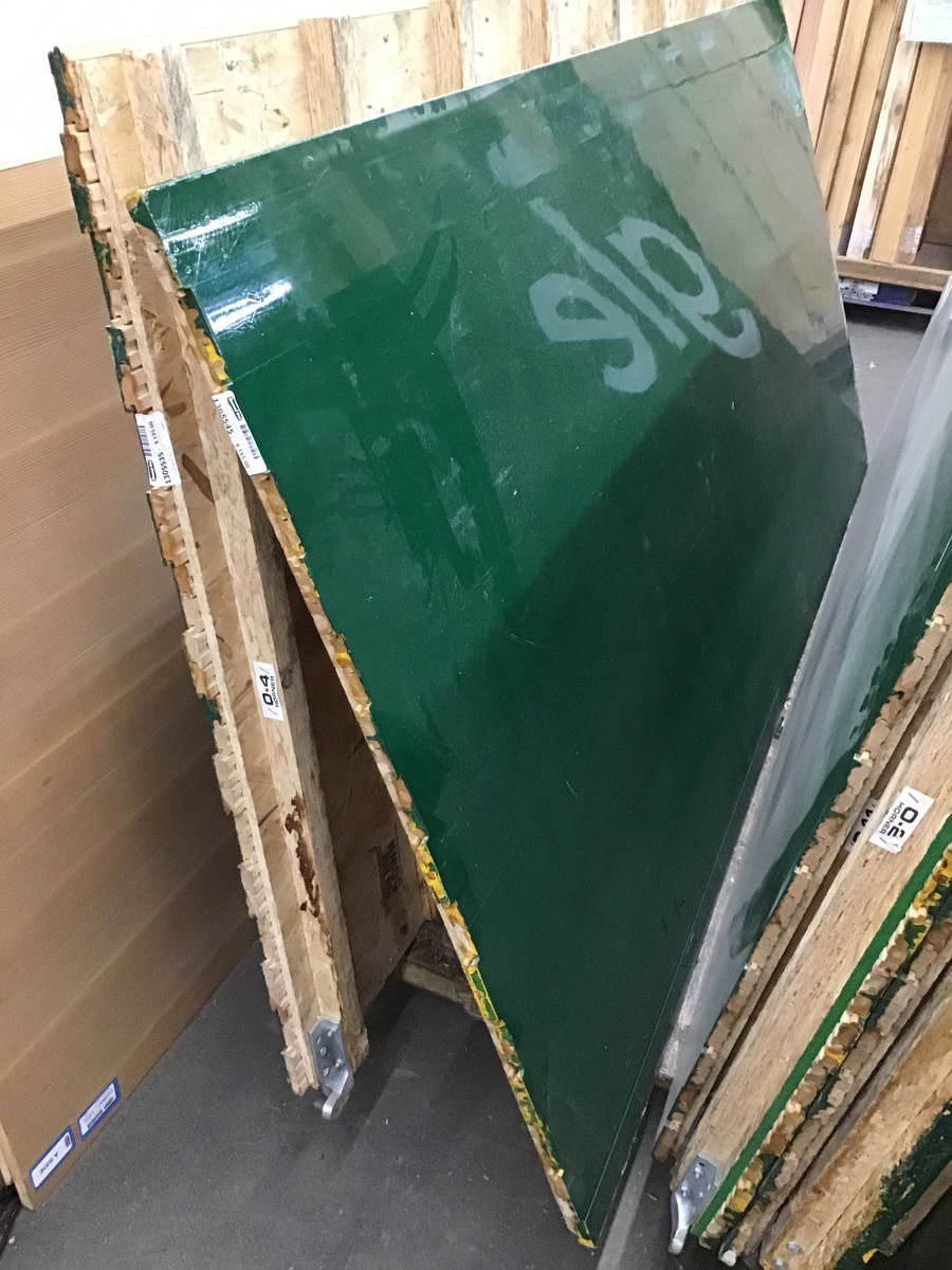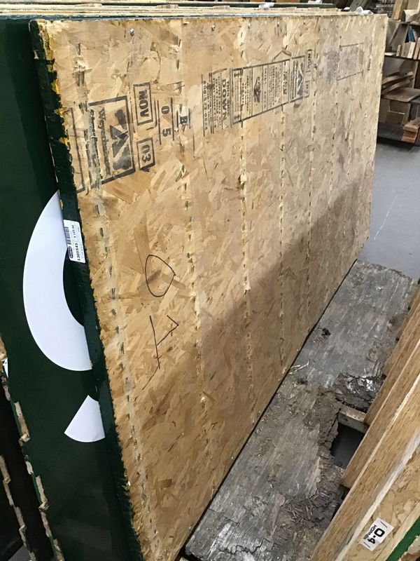 Unlike most of the gym floors we see, which are cut out, these have nice clean edges which would meet up neatly with the next panel. Plus the ends match up with every other two boards being offset. The panels are mounted on a 1/2" thick sheet of OSB. It used to have 1 1/2" high sleepers underneath it, but they've been removed as has any of the interlock system which you'd find on a lot of the panels from this job. In all reality, I'd be tempted to put no sleepers of some type under it just so I didn't have to fight the staples that are protruding from the bottom of the OSB. Price reflects the lack of sleppers, but that could actually be a plus depending on your application. This one has is all green. Dimensions are approximate.