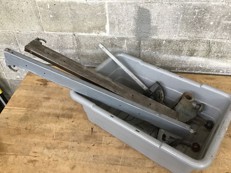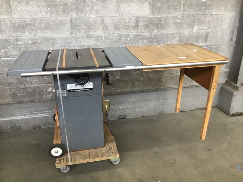 This is a 12" Rockwell contractor's table saw that runs on a a single phase motor. Someone added some extra length to the table as well as two wheels on one end for ease of movement. Comes with two fences and a miter fence. This item was tested in our receiving department and appears functional.
