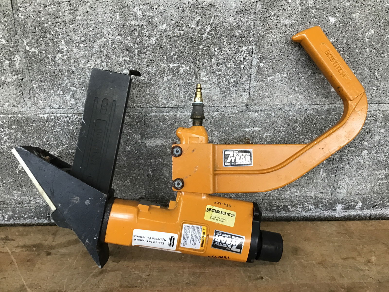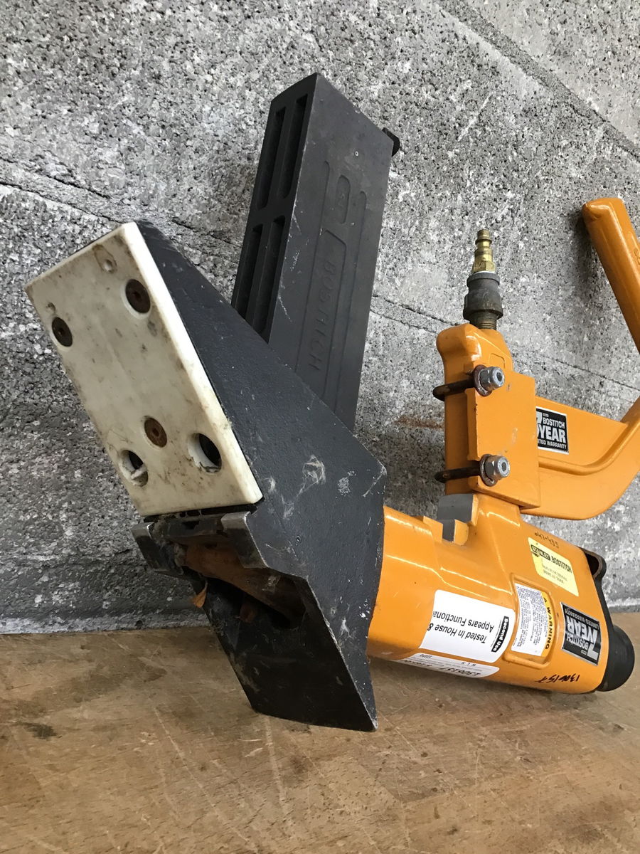 Bostitch pneumatic flooring nailer. Does not come with a hammer. Does appear to function when hooked up to a compressor.