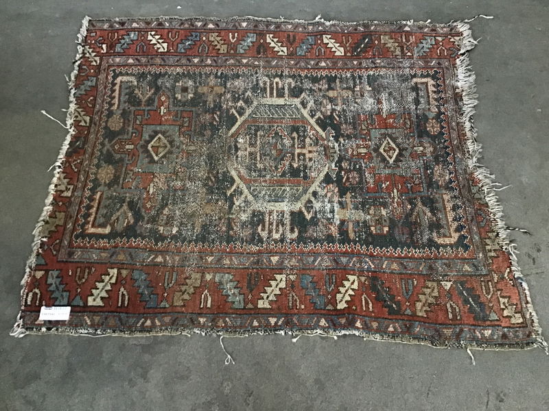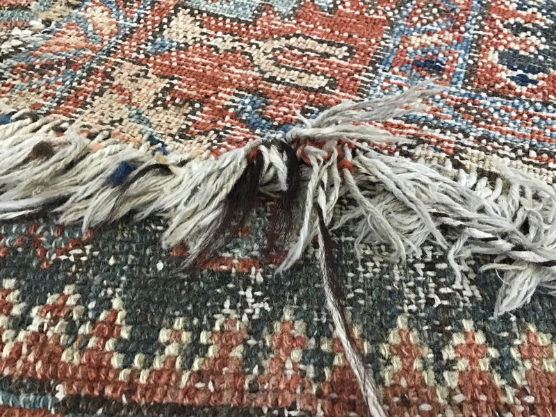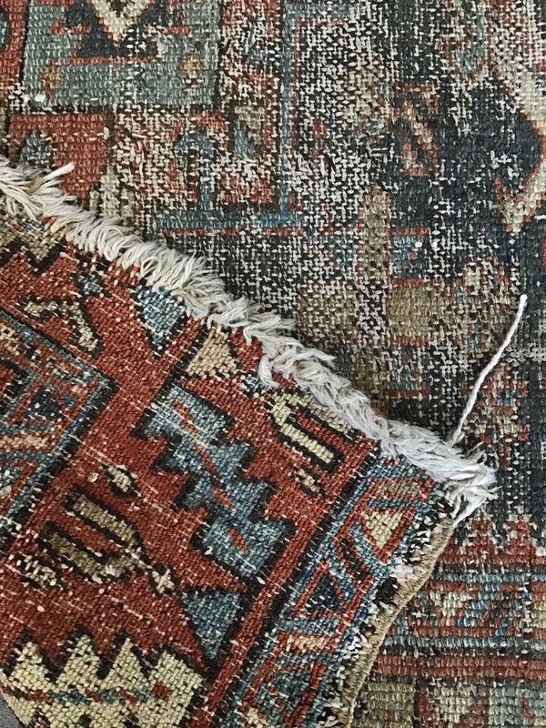 Enchanting hand-woven Persian rug with camel hair weave and bold tribal symbols. Charmingly worn, with some threadbare sections and a bit of fraying along some of the edges; price reflects. A great size for a bedroom or reading corner !