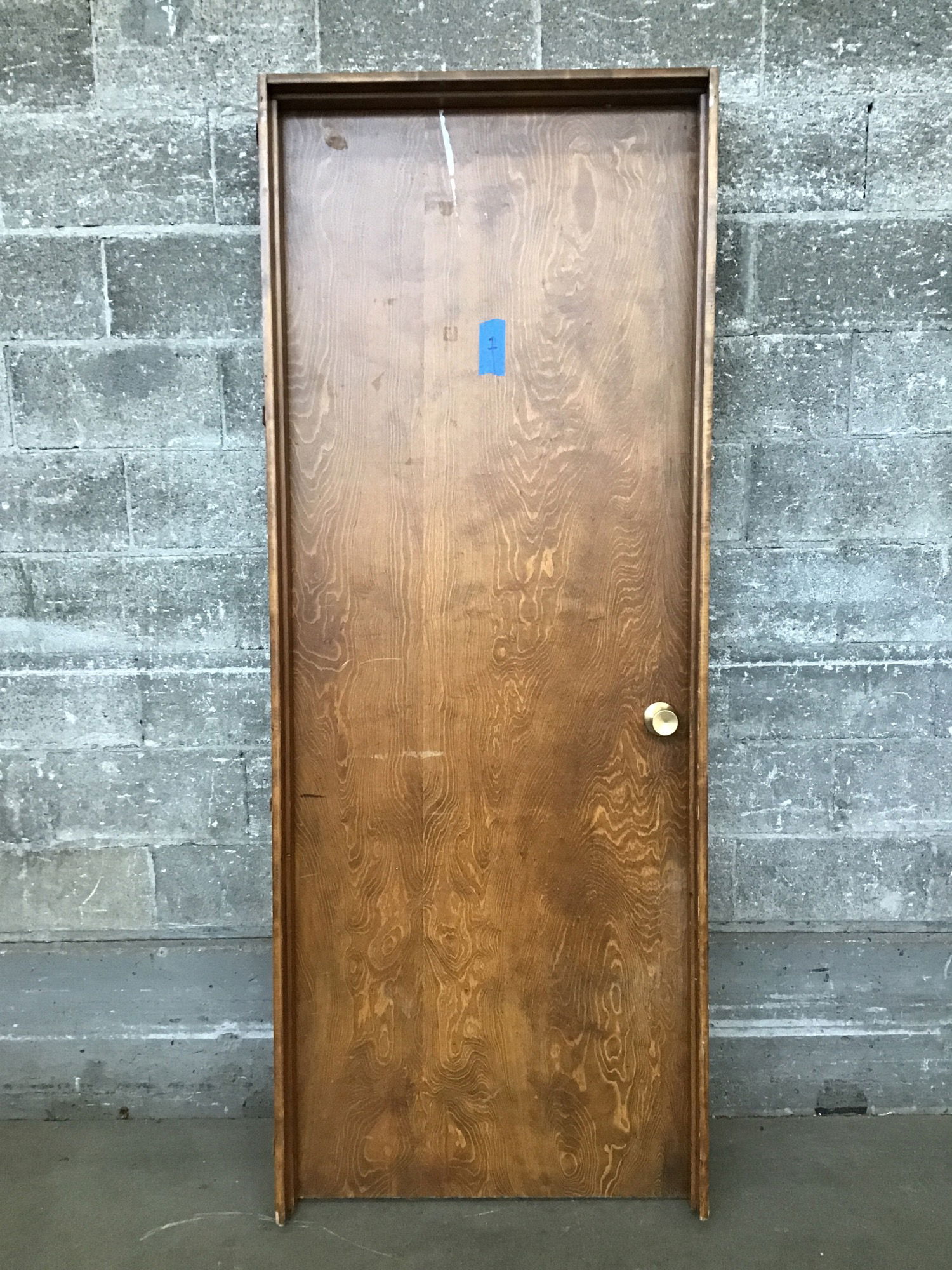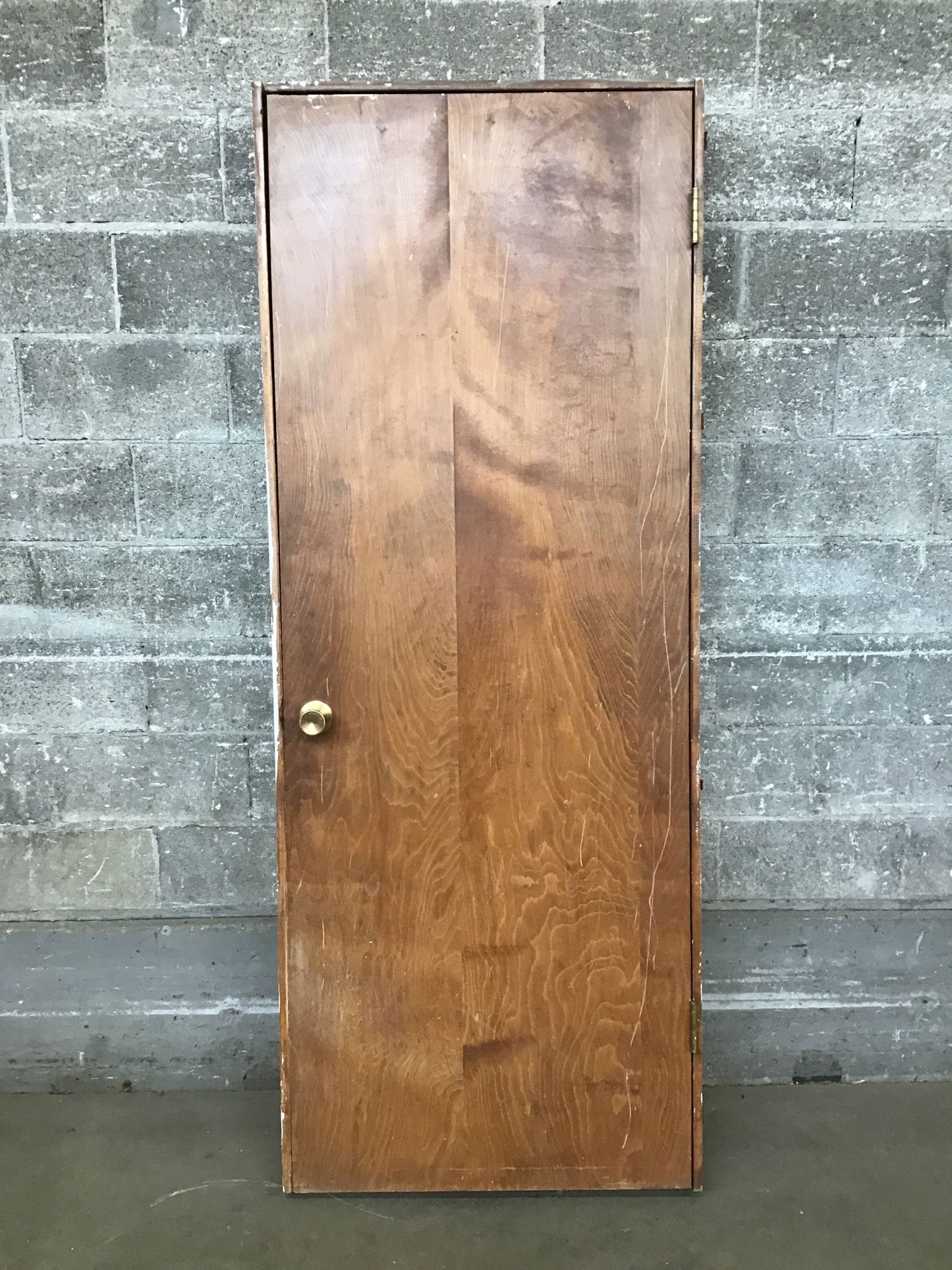 A prehung hollow-core door with an oak veneer. Has a couple screw anchors installed for a robe hook.