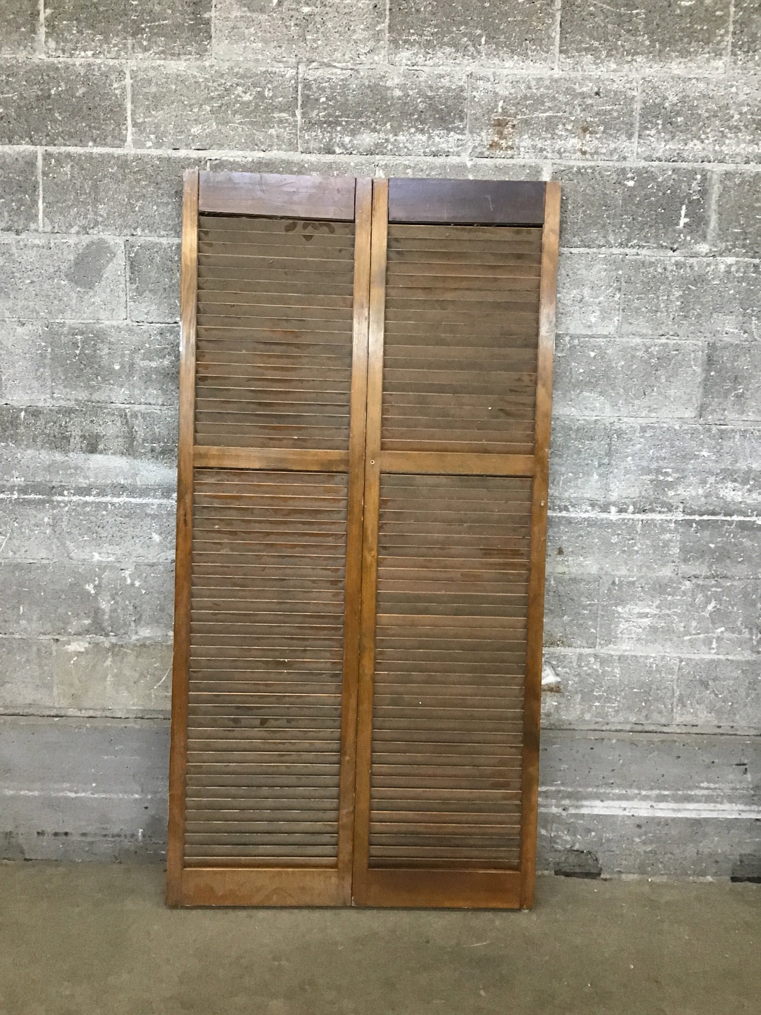 Bi-fold door with stained wooden finish, its a little shorter for a louvered door and the price reflects.