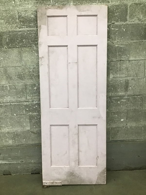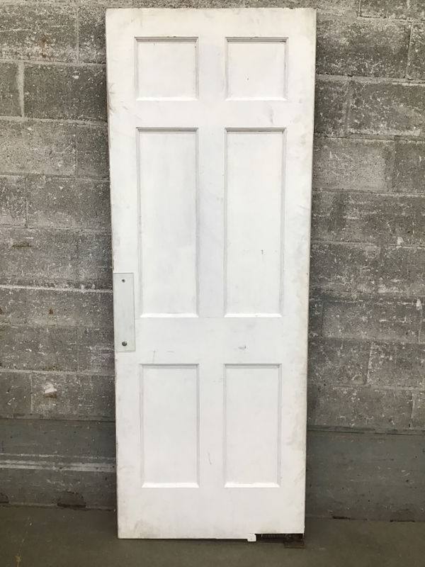 Vintage butler door with spring loaded hardware on the bottom corner, glass push plate, white paint on one side and lavender on the other.