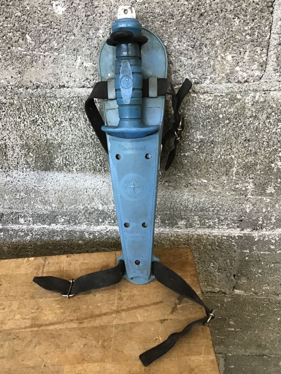 Here we have a vintage diving or scuba knife by Equipos Nemrod. The knife is non-serrated, and slightly rusting. It includes the sheathe with straps for attaching to ones self.
