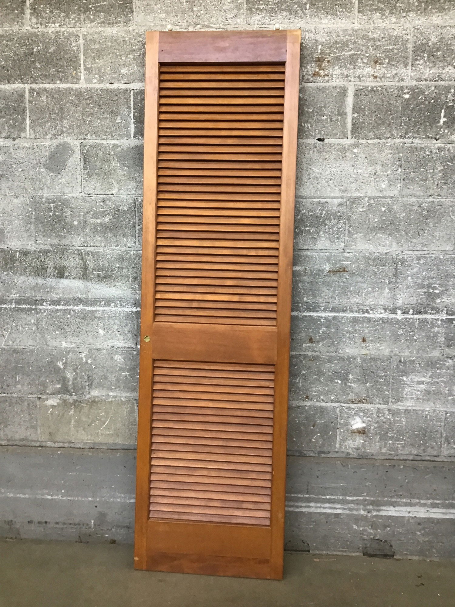 Stained fir louvered door with some minor cosmetic scratches.