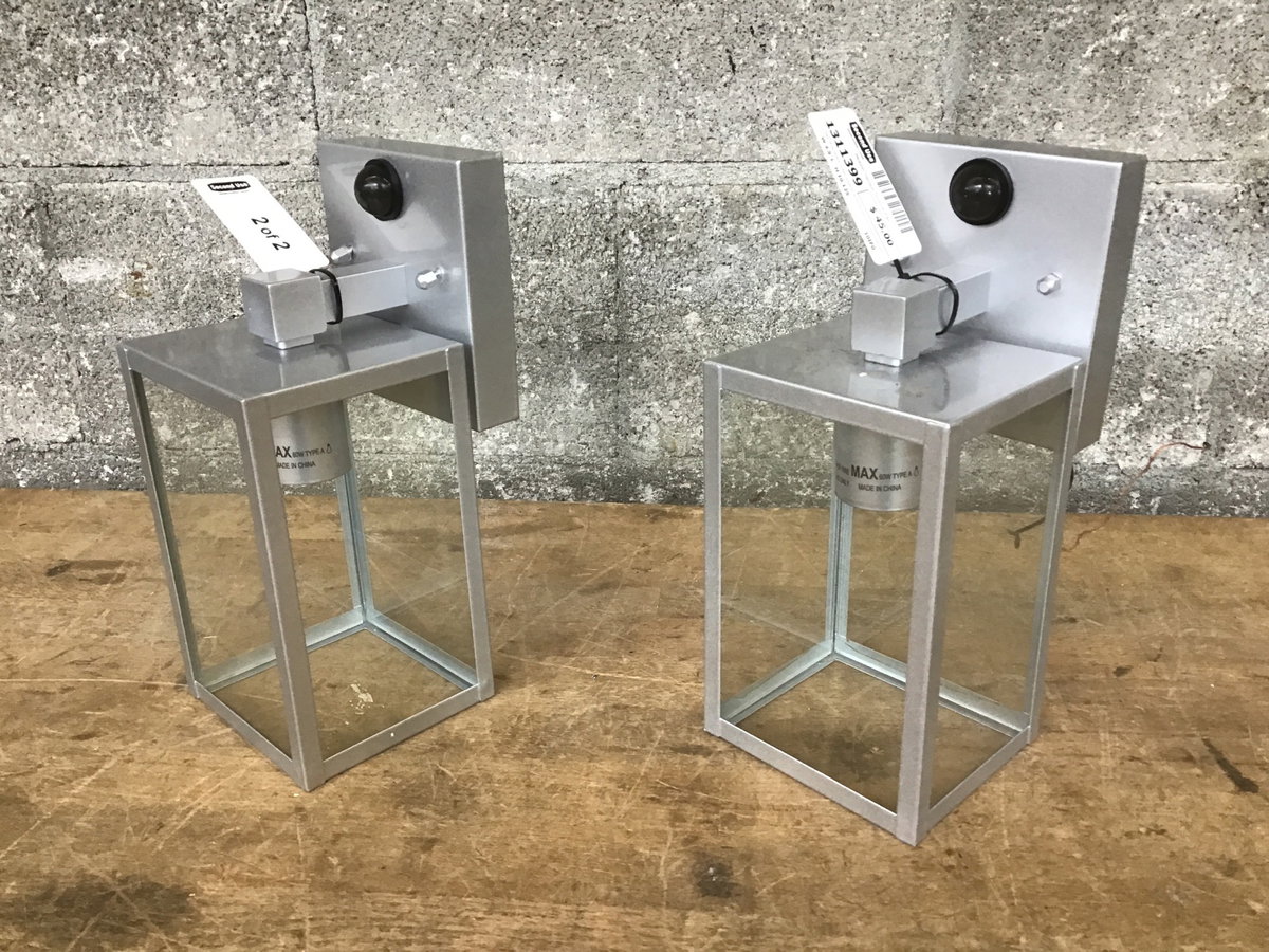 Pair of brushed nickel outdoor sconces with a motion sensor on each. This has not been tested in-store, but these appear functional.
