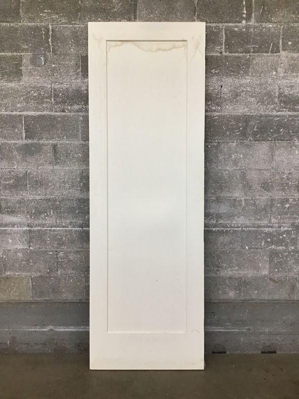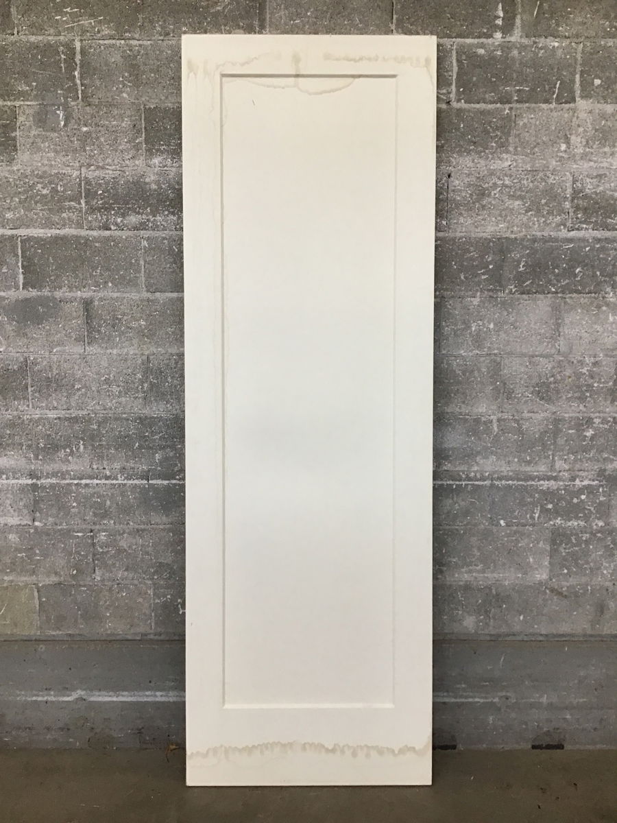 A hollow core door with one faux panel. The primer's got some weathering to it, but the door itself looks to be in good shape. No knob hole has been drilled.