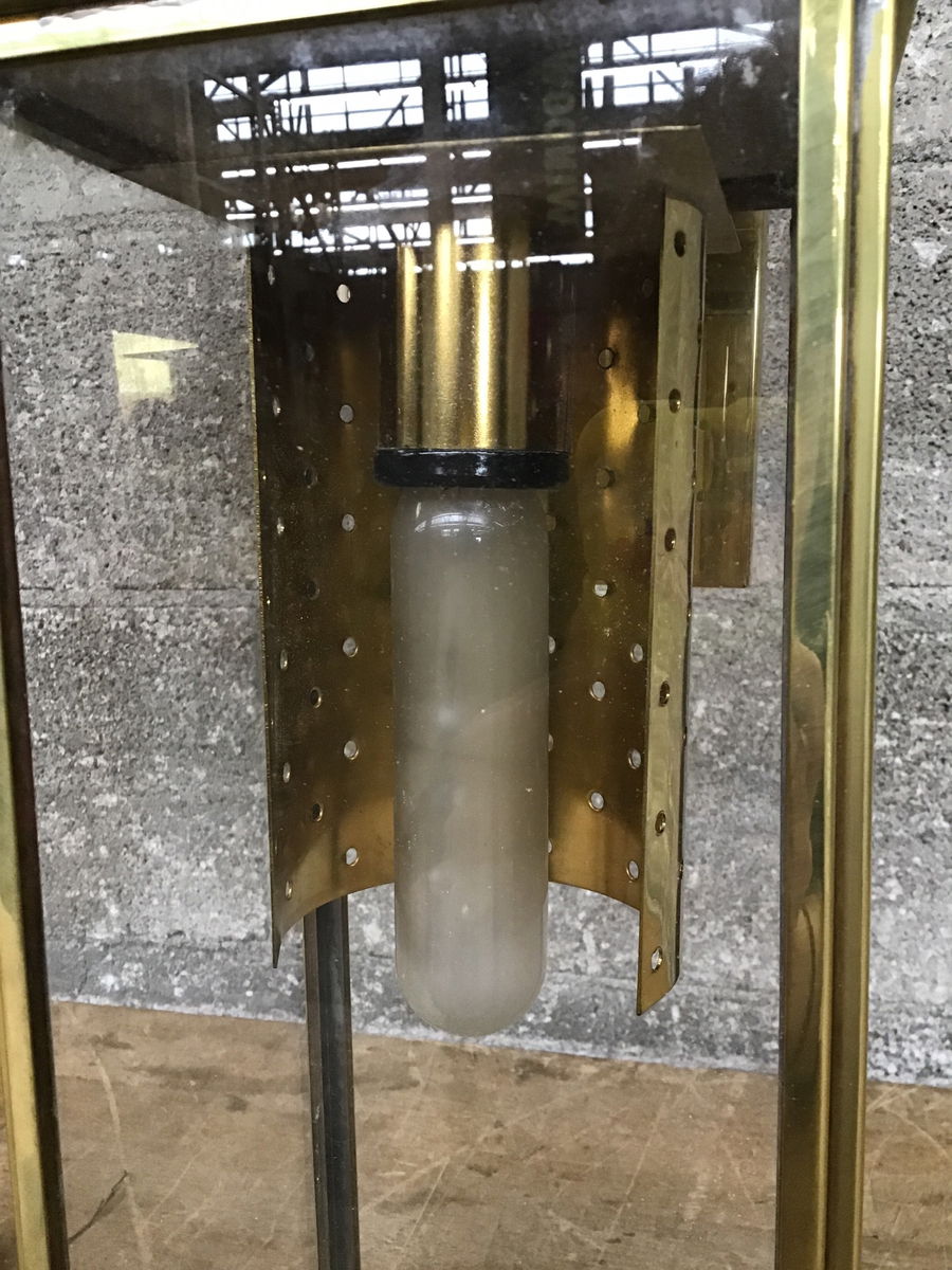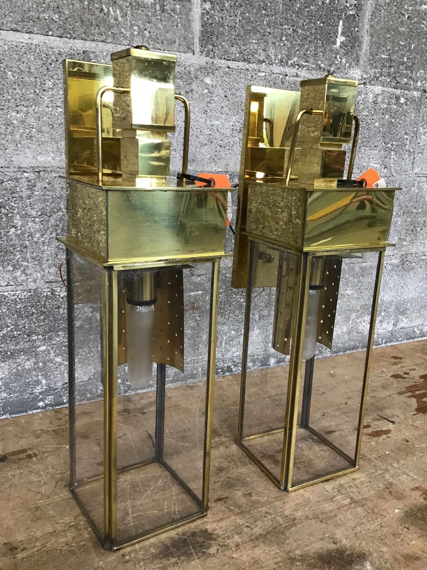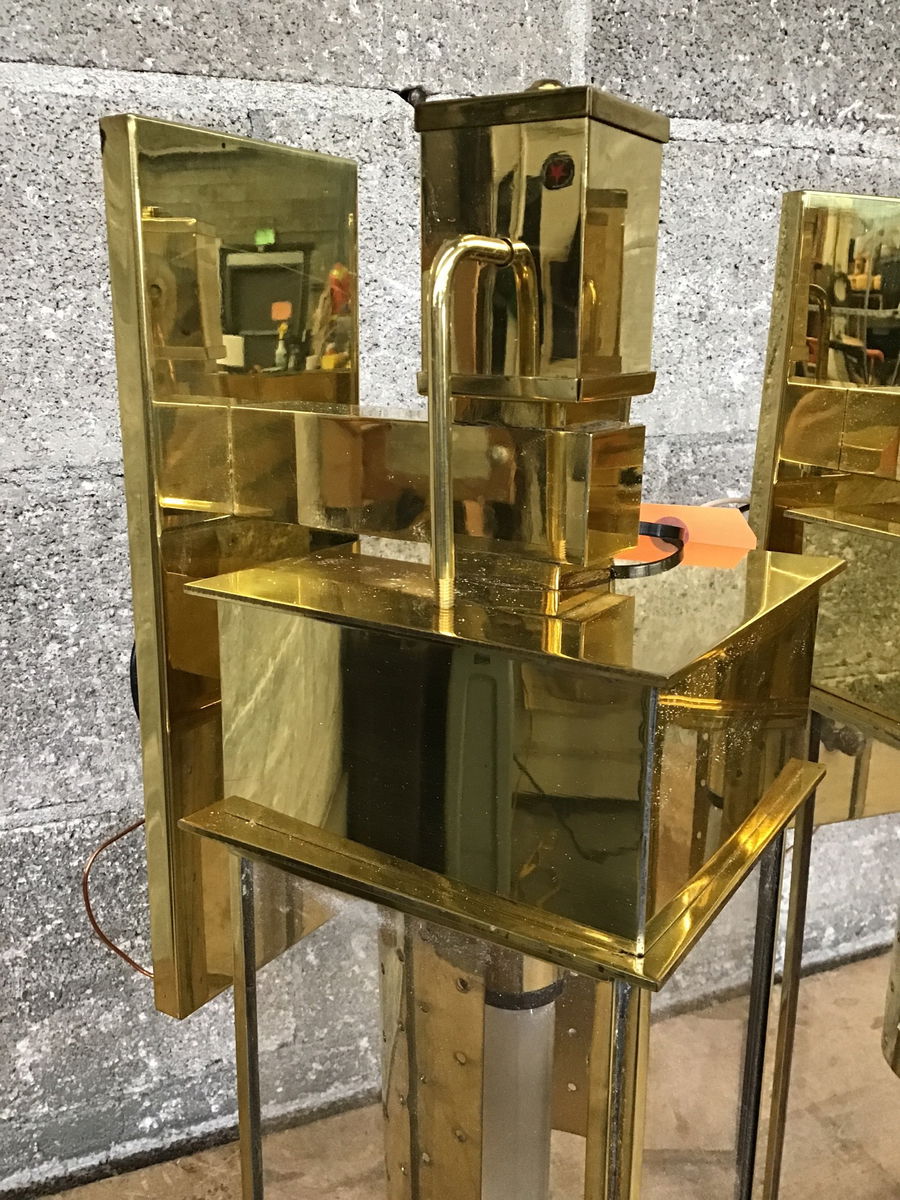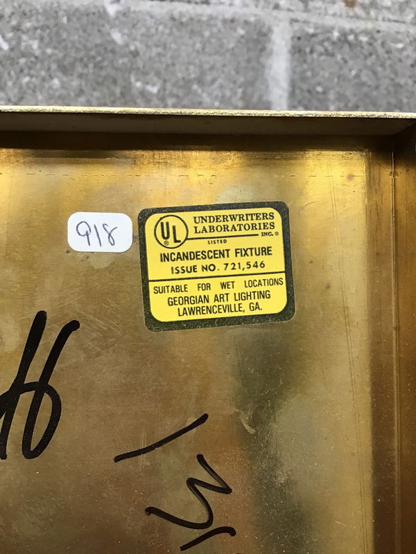 Pair of stately brass finished wall sconces made by Georgian Art Lighting and marked "Suitable for Wet Locations." They don't look like they were used in an exterior application, but could be.