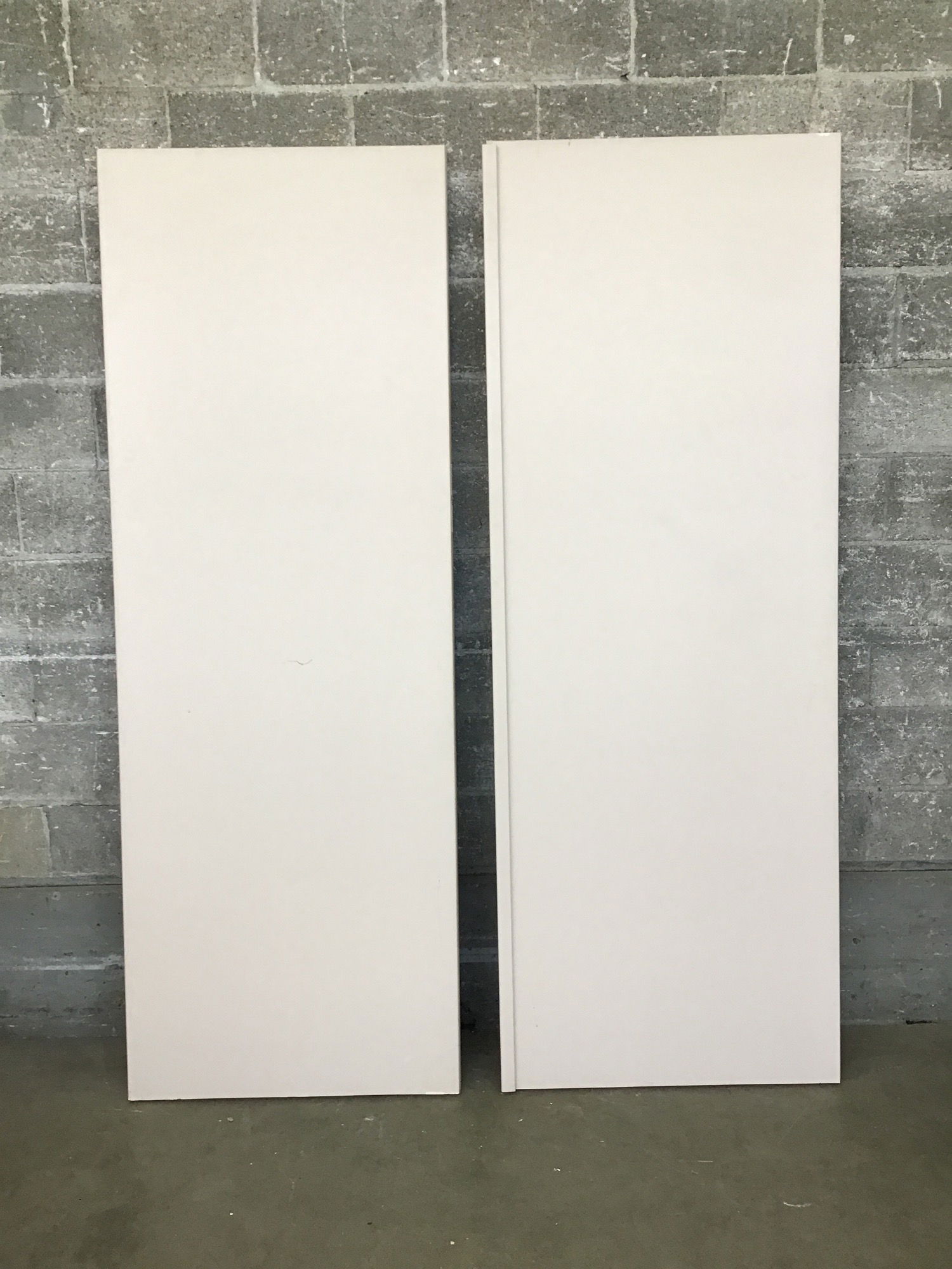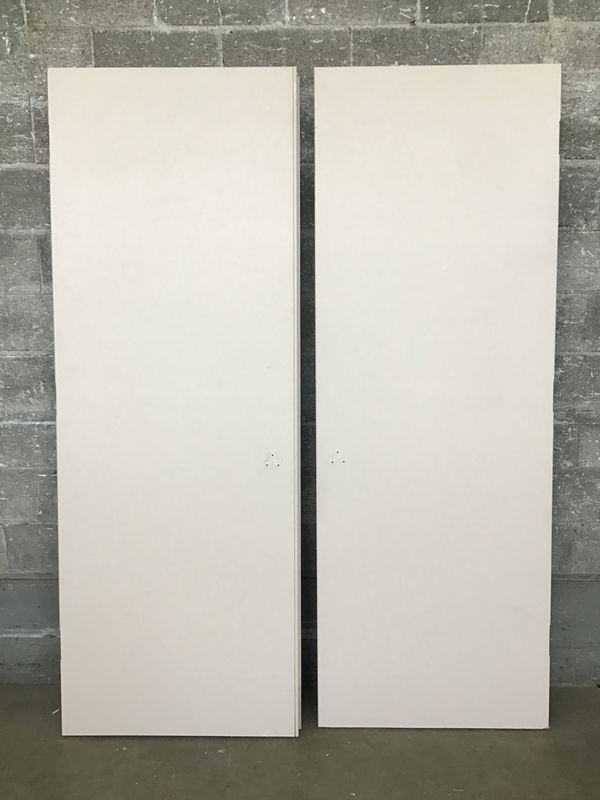 Overheight solid core slab doors with a soft grey paint job. Exterior thickness, but were used inside.