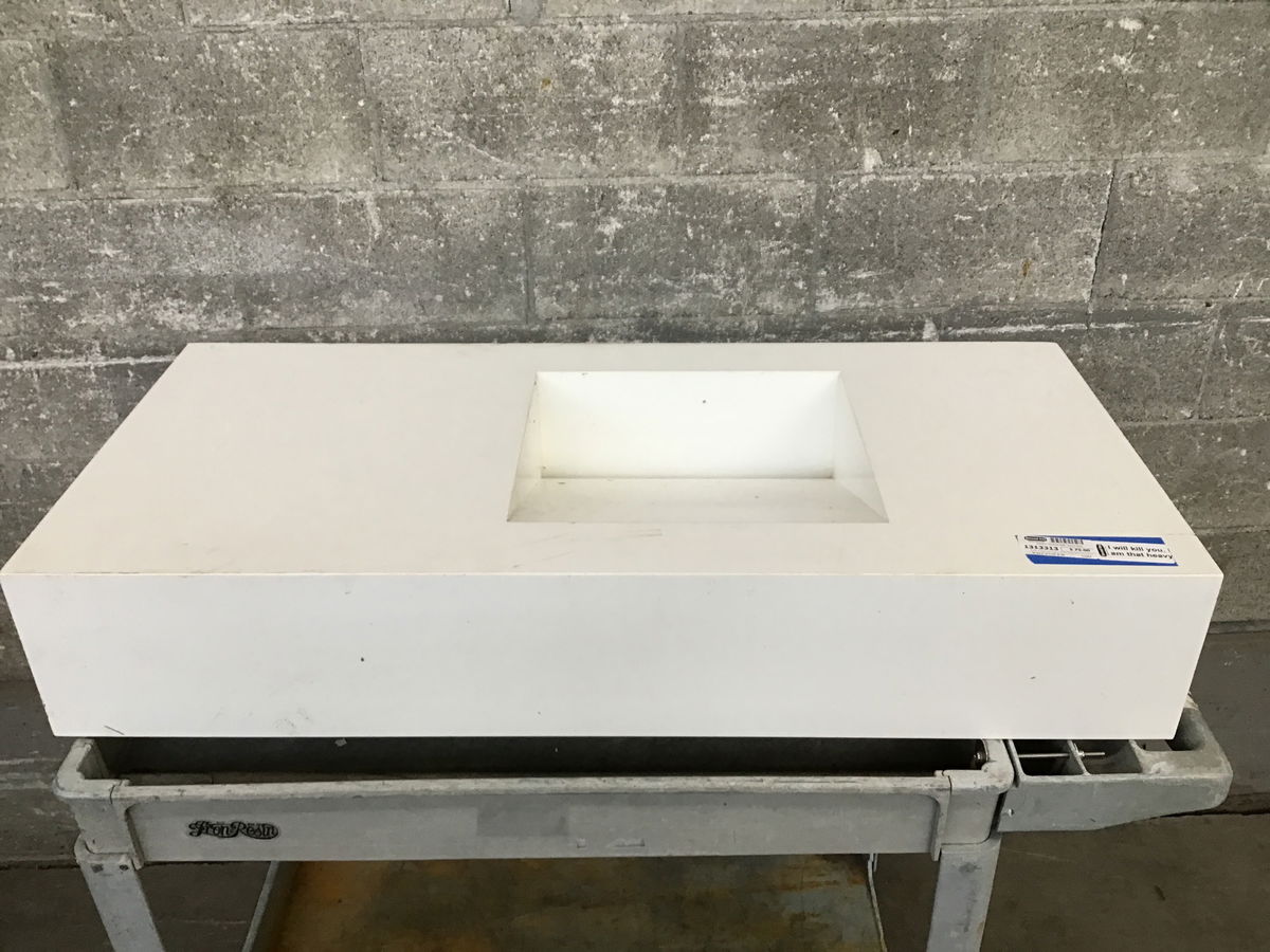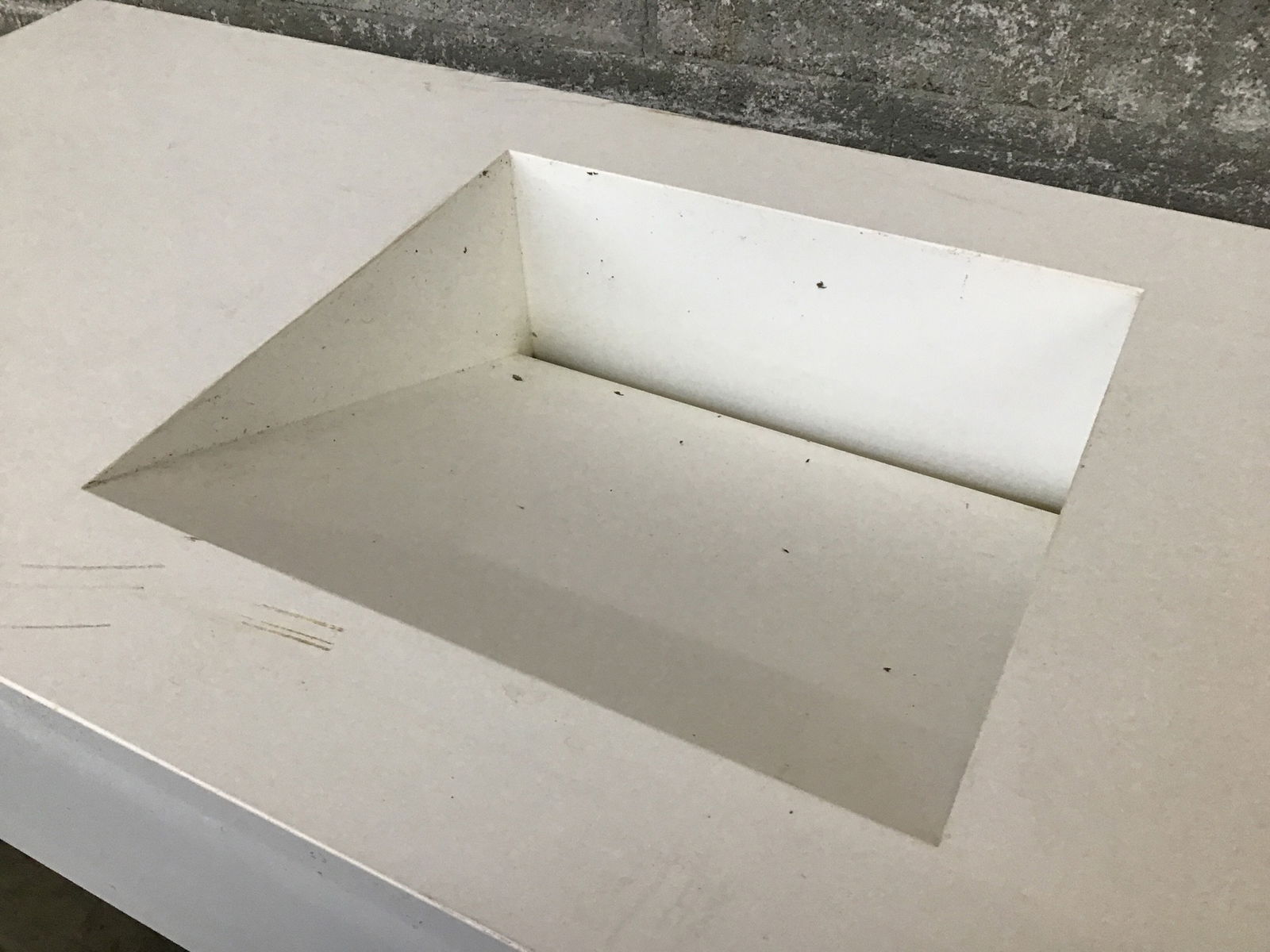 Stylish modern wall mount floating vanity sink unit constructed from a heavy duty stainless steel bracket and 1.25" honed manmade stone with a sloped integrated sink, sorta looks like you are driving into a parking garage. This sink is MASSIVELY heavy, leaving one a little skeptical of its potential to 'float'. There are many spots with streaky cosmetic damage, price reflects. Be sure to bring a buddy and some wheels to move this one!