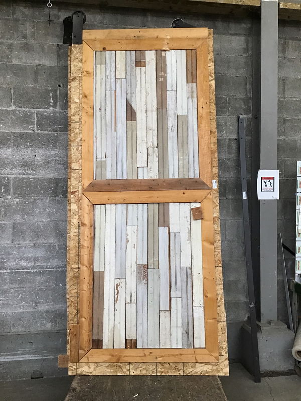 Not even sure where to begin here: This is a monstrosity of a barn door at just over 9' tall and made of a seemingly random assortment of different lumber materials. Comes with one roller and hardware. Price reflects