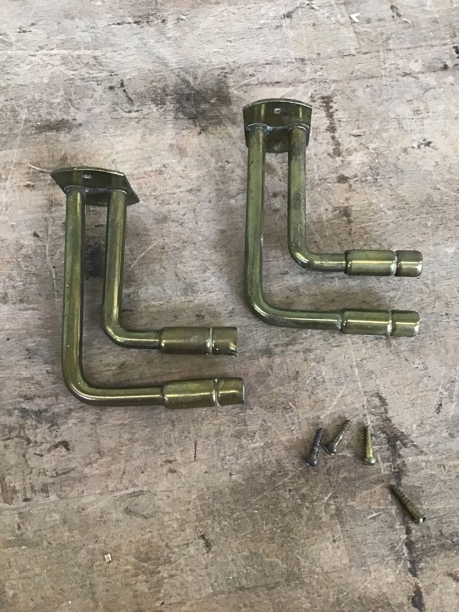 Pair of brass double curtain holders in very good shape. Designed to hold a set of sheer curtains closer to the window, and your heavier curtains in front to block more light when needed. Ends are spring-loaded to make room for a curtain rod to be set between them.