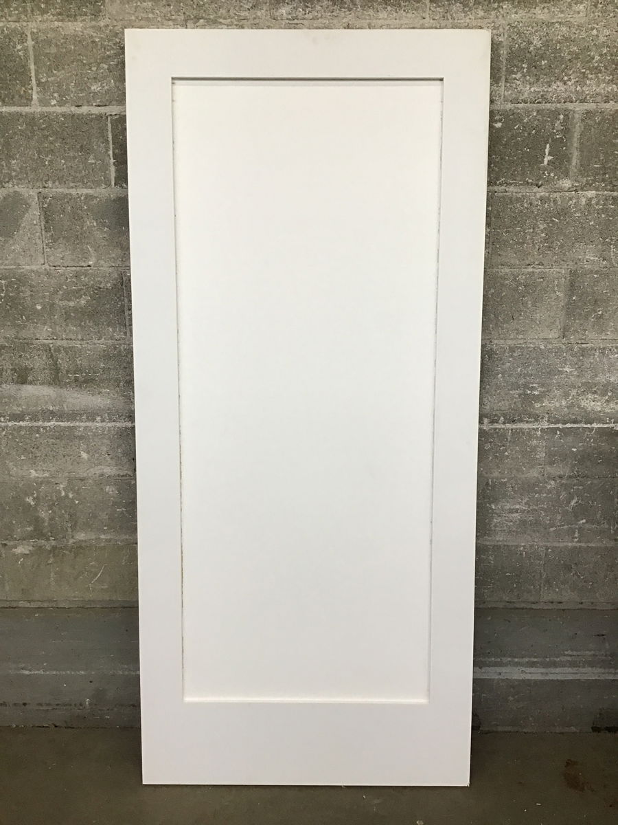 Primed masonite, Shaker style one panel interior door that's exterior thickness. Probably intended for use between a house and attached garage. Price reflects masonite skin chip on one top corner.