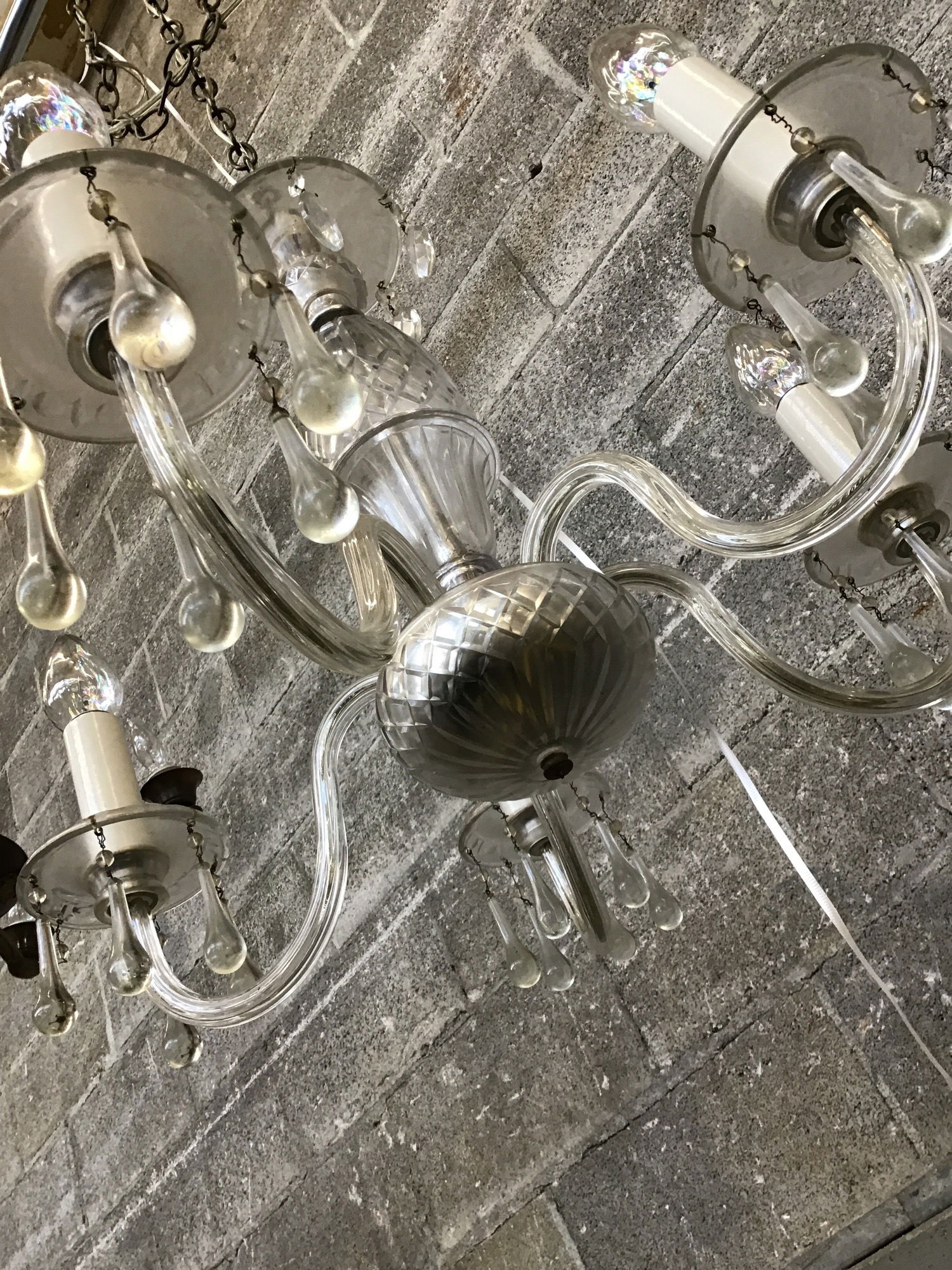 Classy, vintage cut glass chandelier with various dangling crystals, of which, four total are missing. The light functioned when we tested it and the wiring looks OK. If you really want to spruce this gem up consider giving it a spa day with our lightshop!