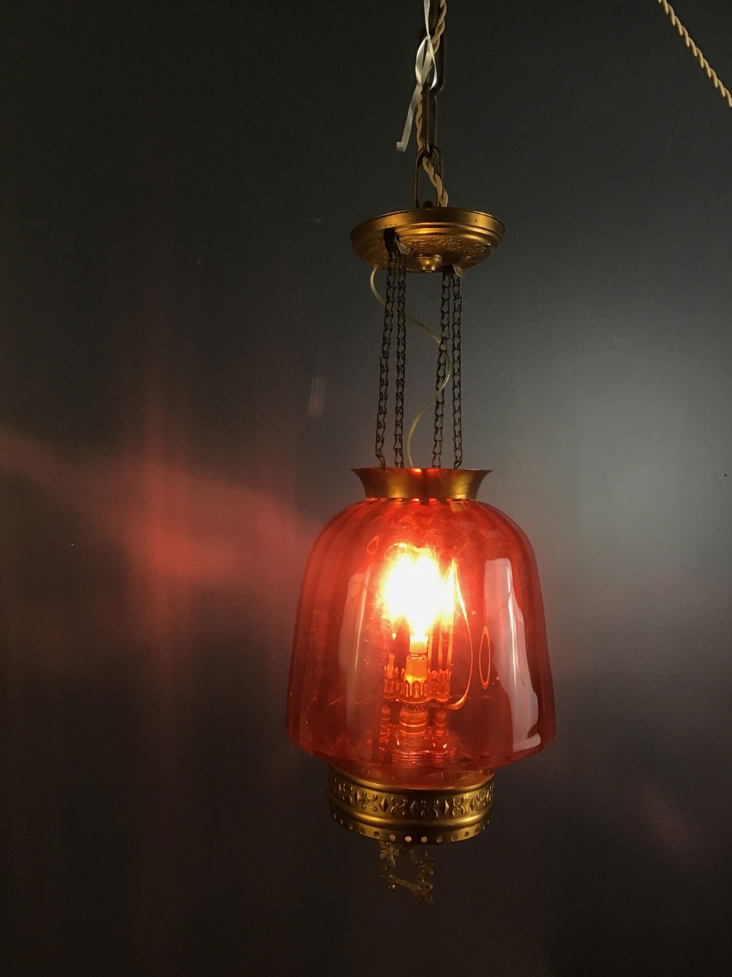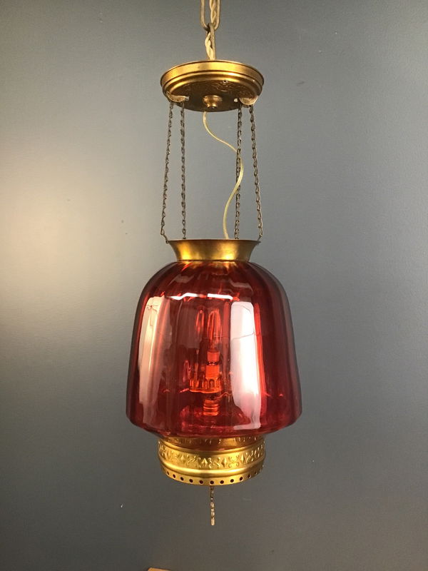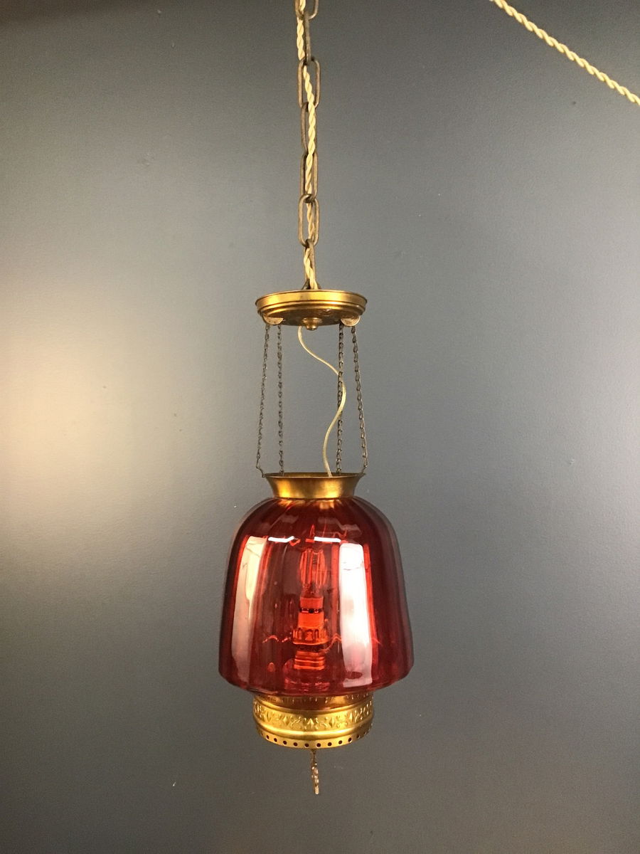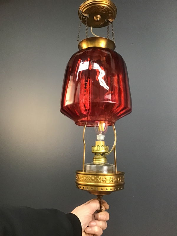 A gorgeous Victorian Era oil lamp, with a pulley mechanism so that it could be lit. Although it is still in working condition, it's not needed as this light has been electrified! It comes with 14' of antique style rayon covered twisted cord, a plug and a switch. This is truly a beautiful light! It was rewired in our on site light repair workshop