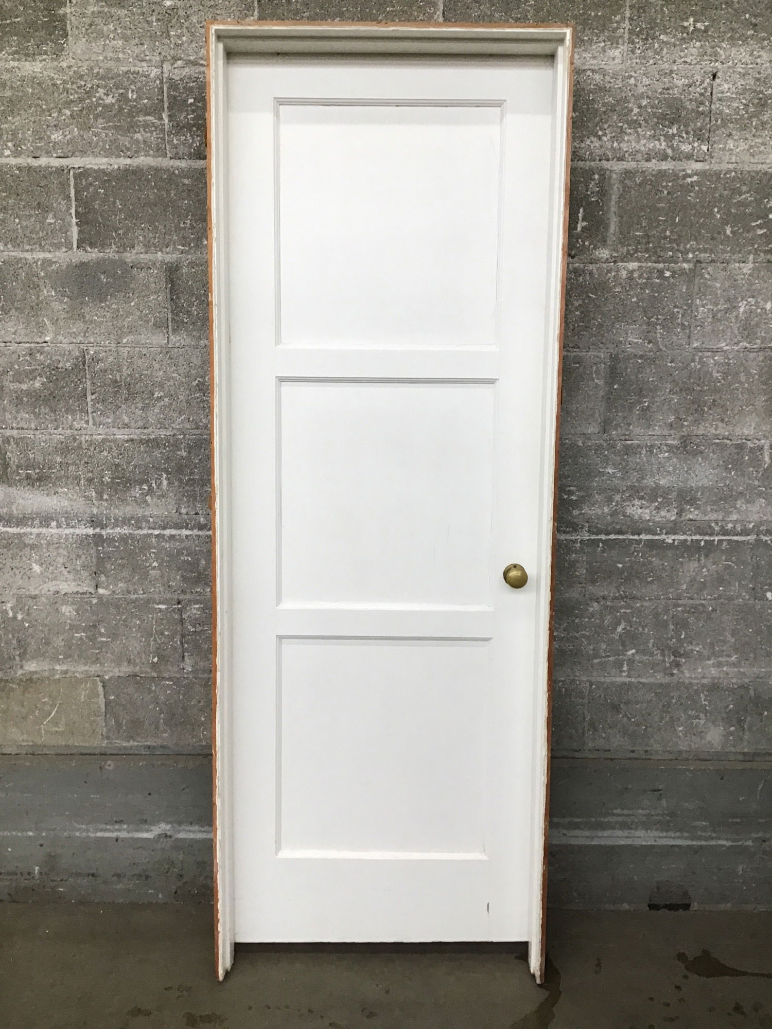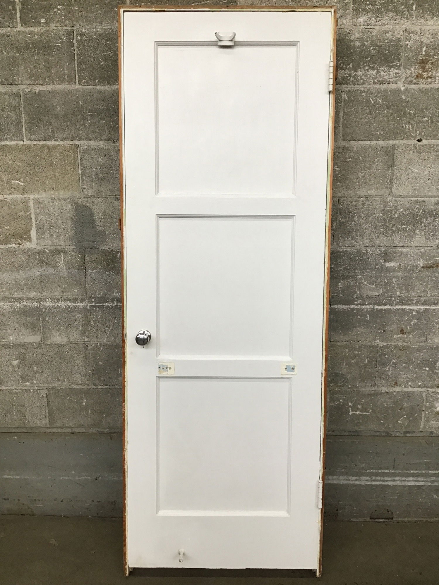 Nice 28" 3-panel door in jamb with cute vintage handles. A couple layers of paint but it's in good shape overall!