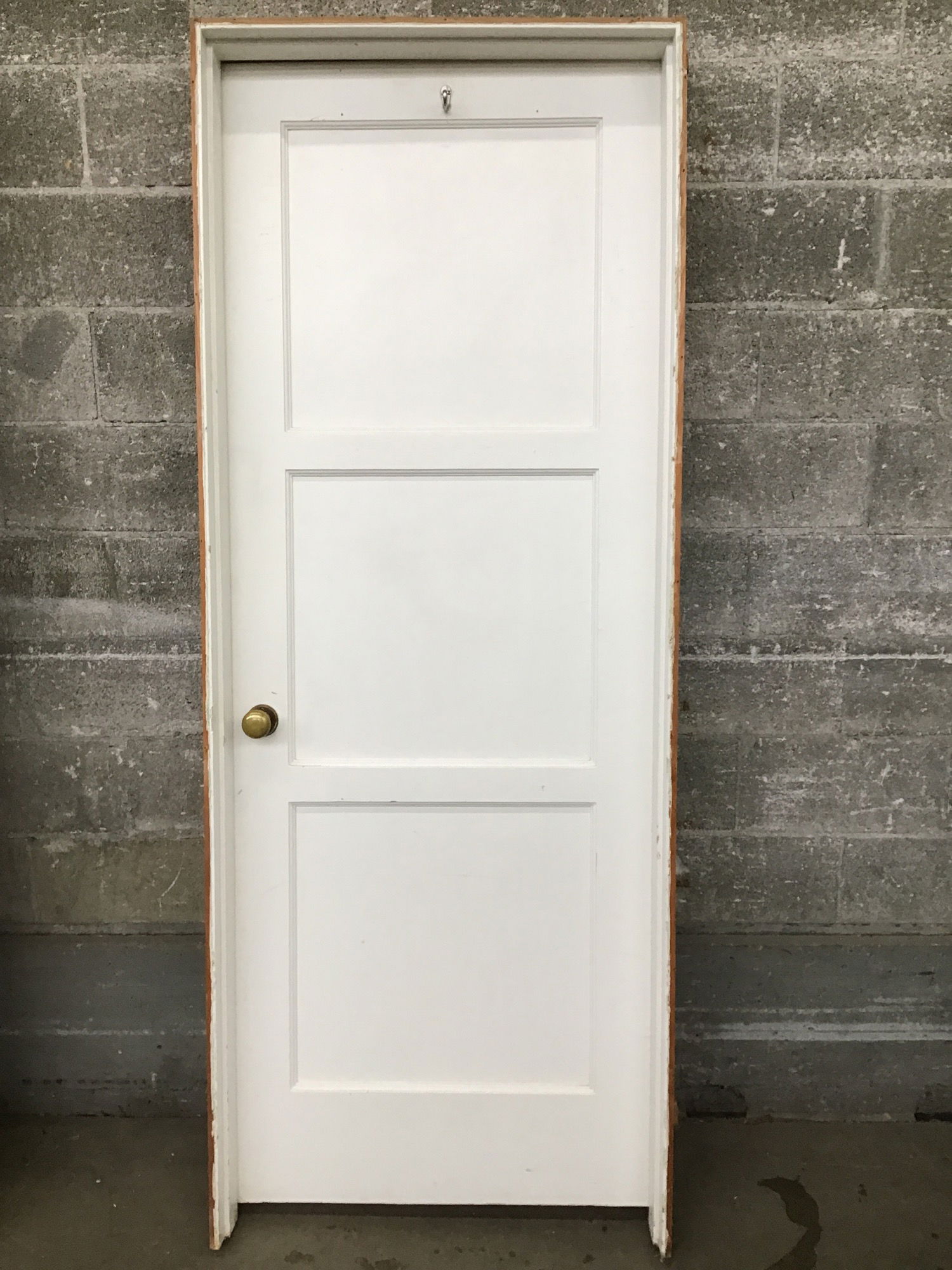 Nice 30" 3-panel door in jamb with a cute vintage brass handle. A couple layers of paint but it's in good shape overall!