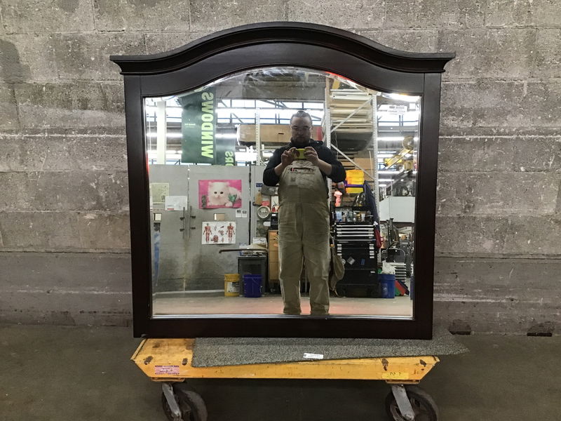 This is a sleek looking beveled mirror in a dark stained mahogany frame with an archtop.