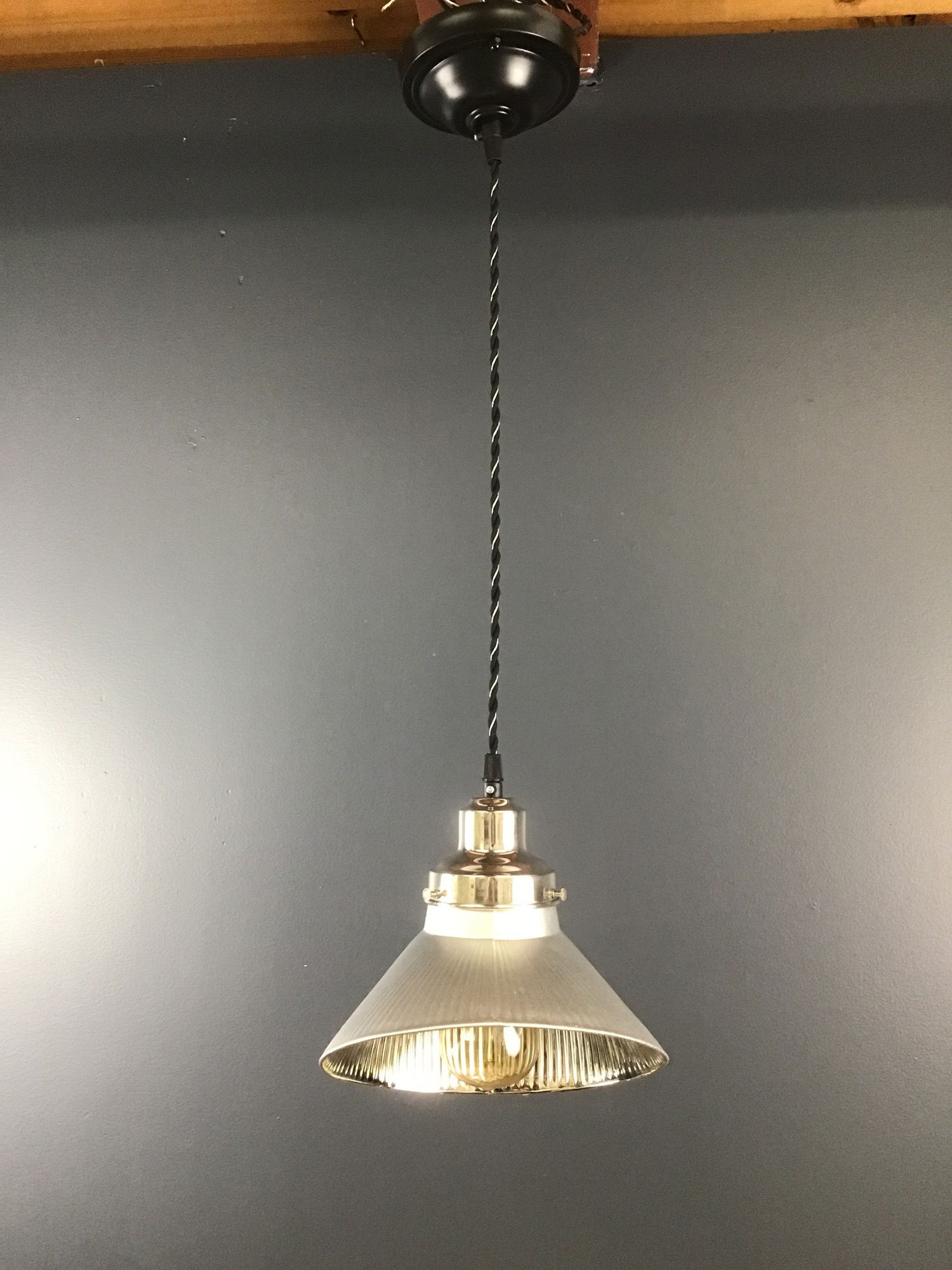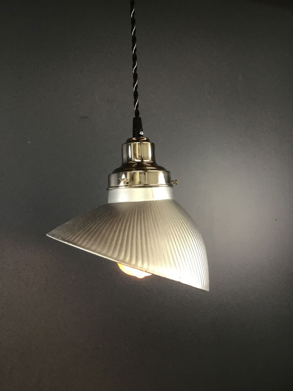 A lovely antique angled mercury glass shade in silver hangs on a twisted cord pendant base that was built in our on site light repair workshop! Lights like this were used in the early 20th Century to highlight certain things or products, such as in a store display window. This light features some antique parts, and some brand new antique style parts. The cord length can be adjusted so that you can hang the light at 11' up to 36".
