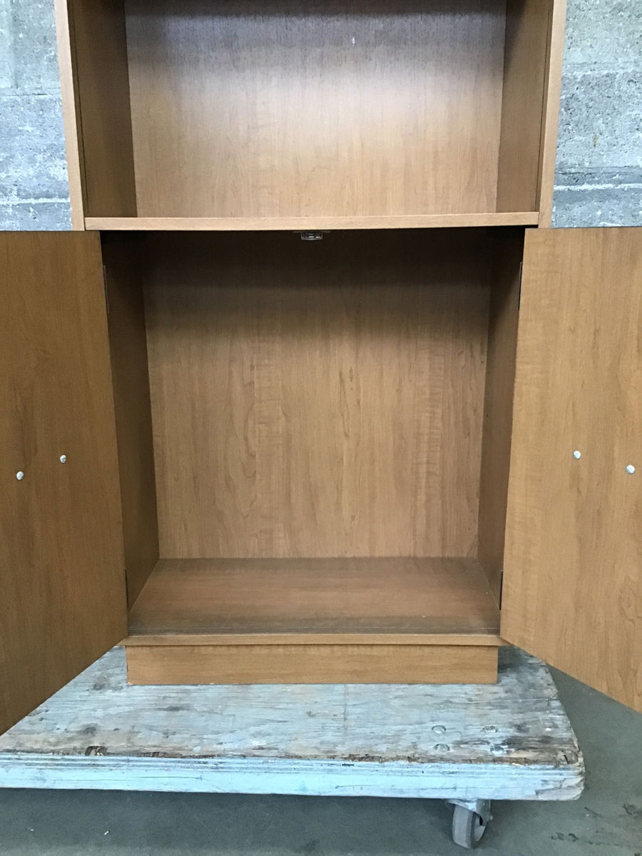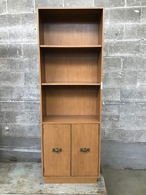 Narrow bookshelf with picture of laminate finish over particle board construction throughout, has a lower section with doors. Includes adjustable shelves.