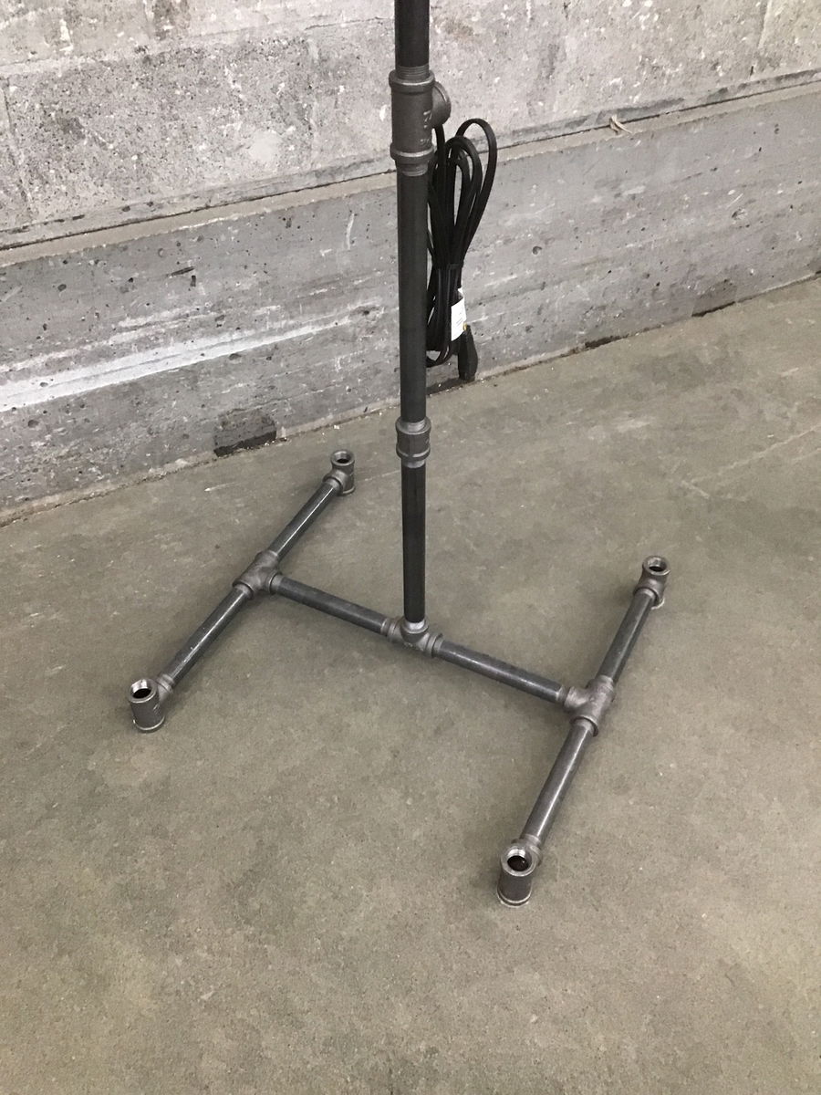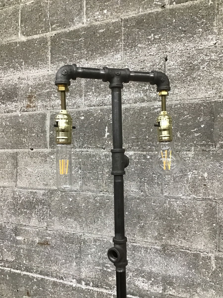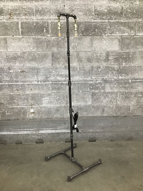 For all y'all industrial vibe lovers out there, we have her a custom made floor lamp assembled out of metal pipe materials. The lamp has a two bulb option and most likely is only meant for indoor use.
